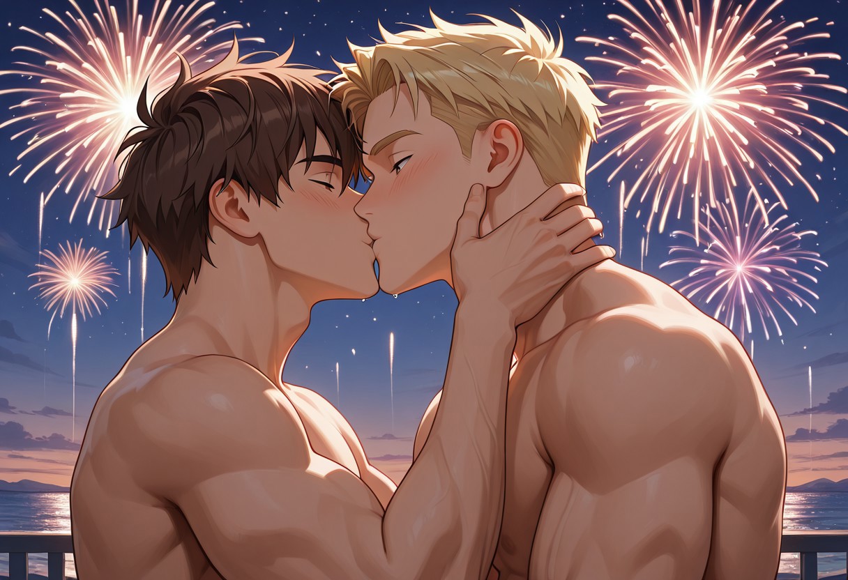 NYEKiss, fireworks in background, kissing, hugging