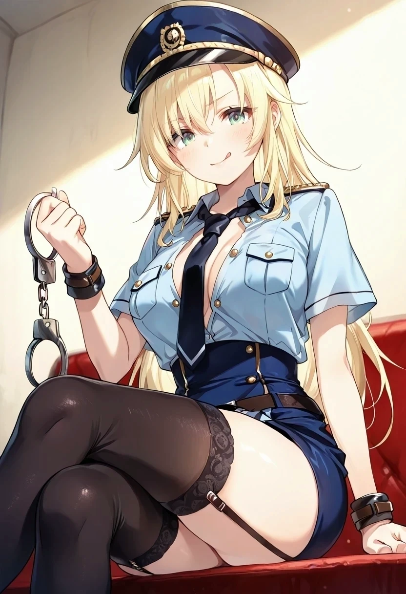 school uniform,blue jacket,blue skirt,long sleeves,black necktie,white thighhighs,