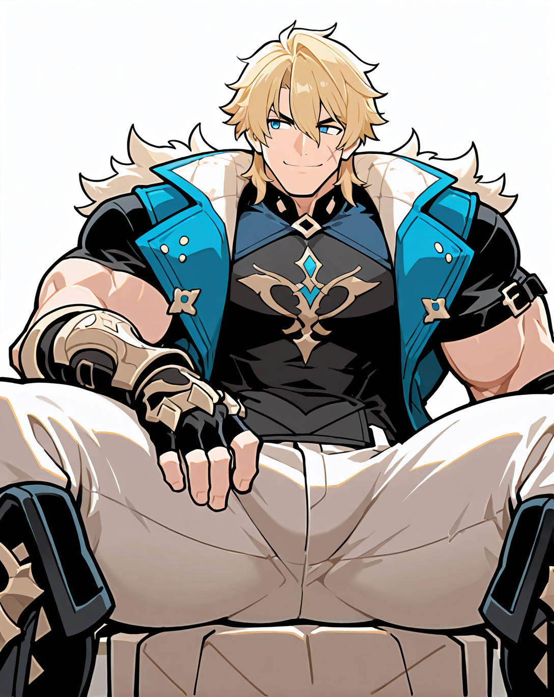 varka, solo, looking at viewer, smirking, short hair, blue eyes, blonde hair, 1boy, gloves, holding, navel, hair between eyes, nipples, full body, cup, beer, holding beer, male focus, weapon, fur, thick thighs, boots, teeth, penis, black gloves, belt, sword, stomach, fingerless gloves, holding weapon, grin, armor, pubic hair, muscular, uncensored, scar, thick thighs, holding sword, erection, abs, bandages, muscular male, pectorals, testicles, squatting, bara, clenched teeth, shoulder armor, male pubic hair, large pectorals, simple background, blue background, penis, large penis, vision (genshin impact), precum, bare pectorals, scar on cheek, on one knee, harness, huge penis, planted, chest harness, scar on chest, planted sword, flaccid, cross scar, large testicles, half-erect, pauldrons, single pauldron