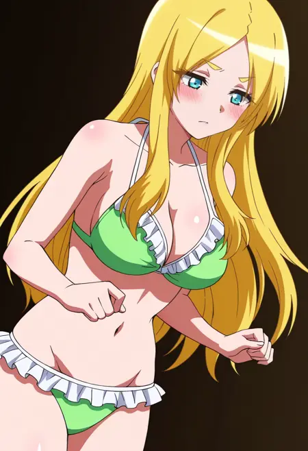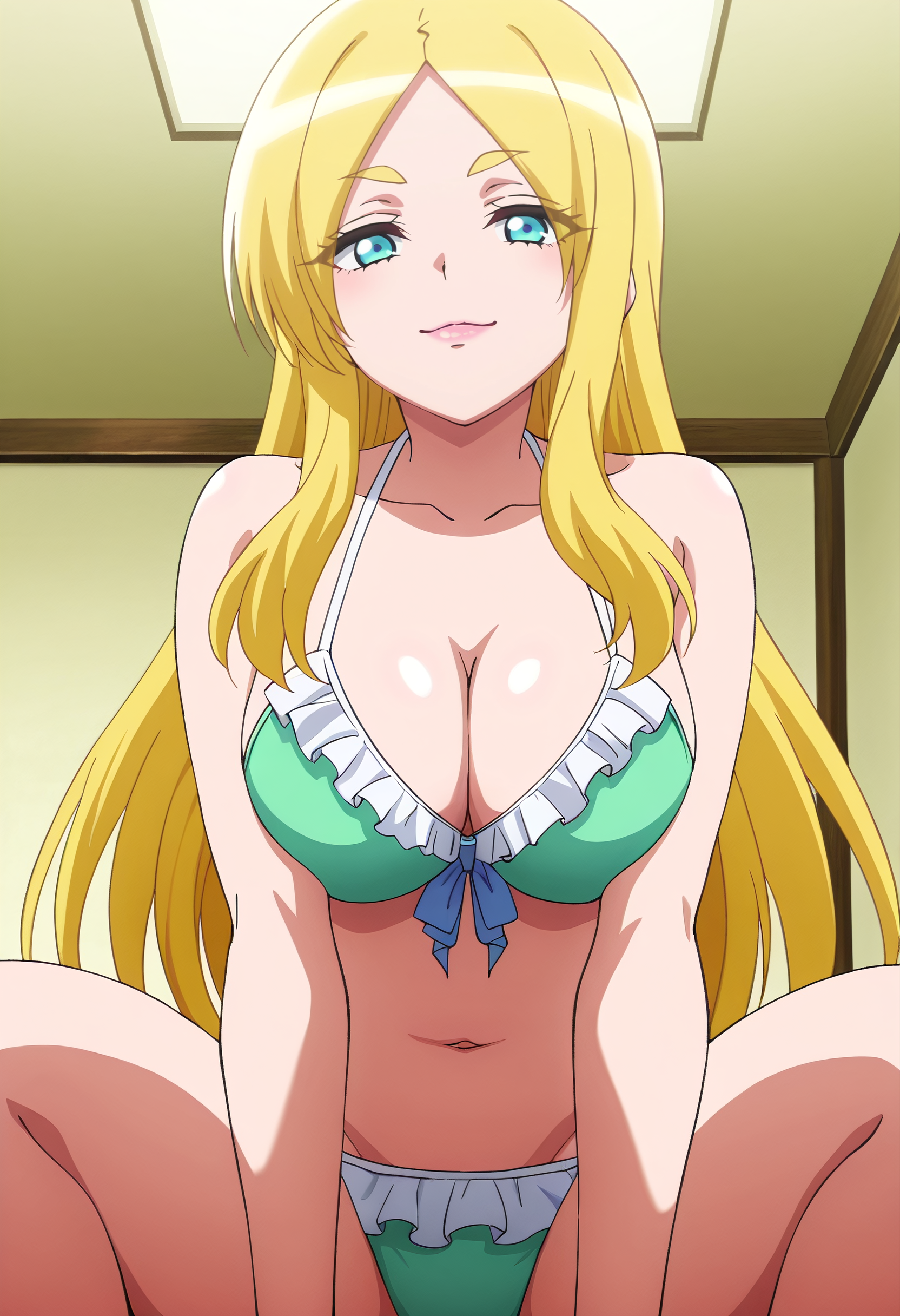 GloriaSwimwear, 프릴, 비키니, 수영복, 프릴 있는 비키니, 가슴 노출, 녹색 비키니, 어깨 드러냄, 낮은 다리 비키니,
