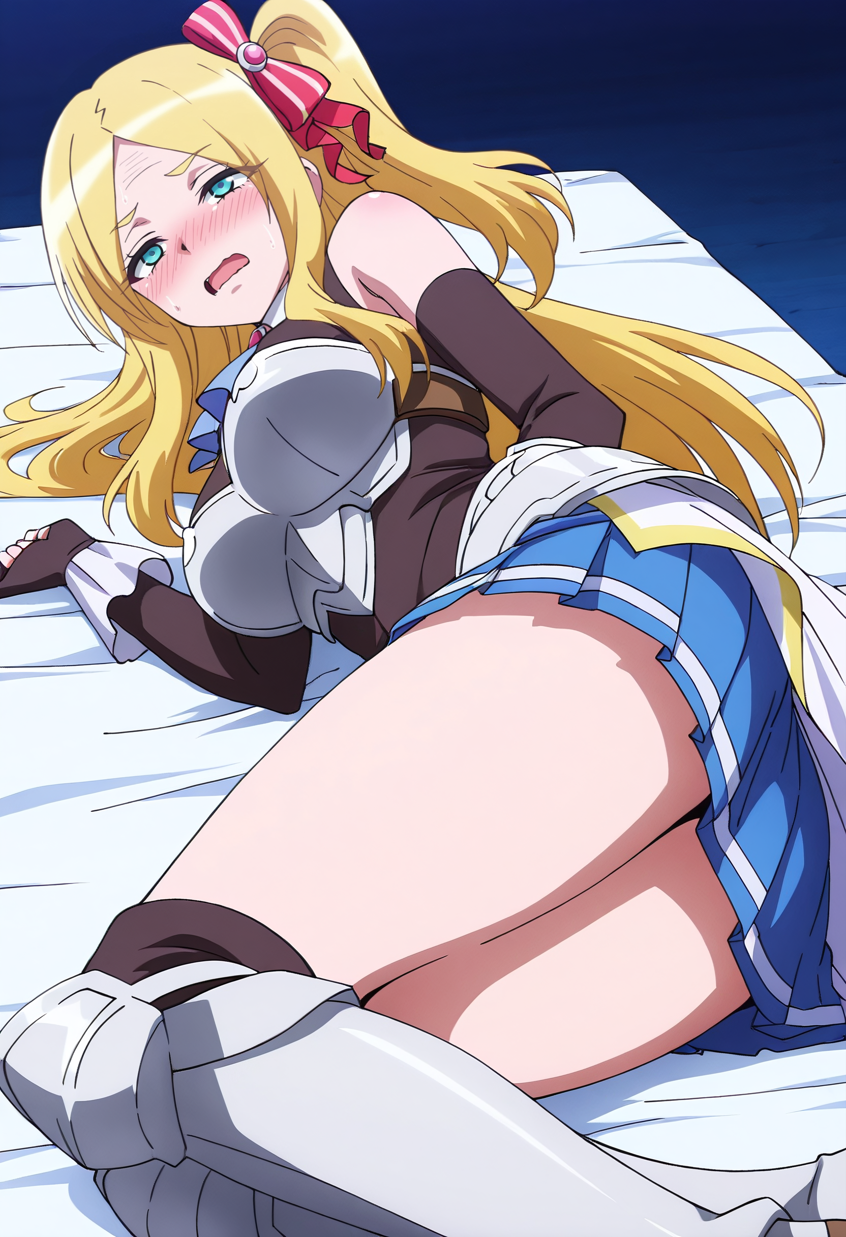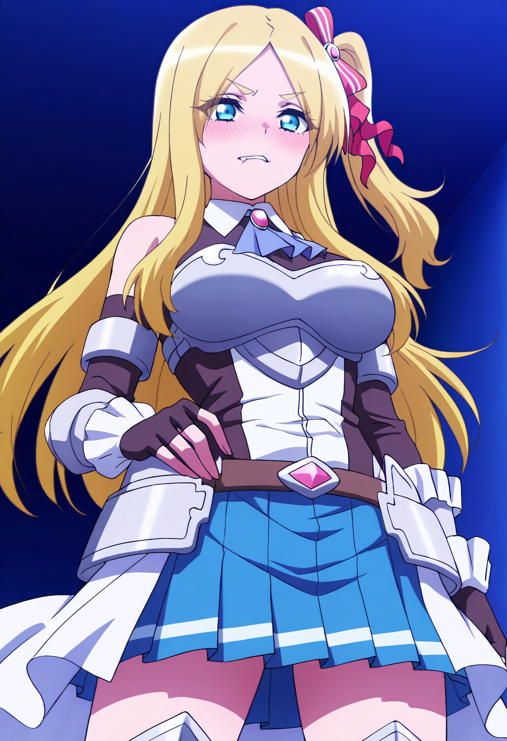 GloriaOutfit, 한쪽 어깨 드러냄, 갑옷, 리본, 장갑, 머리 리본, 가슴판, 활, 머리 장식용 활, 애스콧, 검은 장갑, 치마, 손가락 없는 장갑, 파란 애스콧, 머리 장식, 겐틀릿, 가슴 보호판, 갑옷 드레스, 소매 없음, 주름 치마, 브로치, 빨간 리본, 팔꿈치 장갑, 파란 치마, 검은 셔츠, 셔츠, 줄무늬 활, 소매 없는 셔츠, 갑옷 부츠, 옆쪽 팔자머리, 허리 망토,