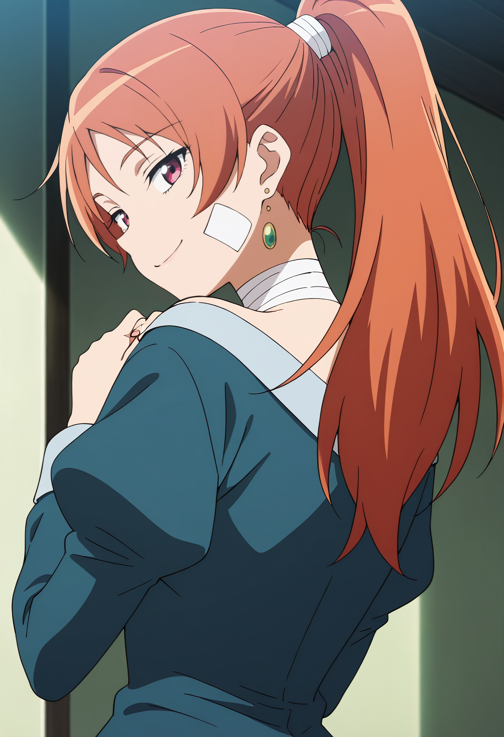 PBBWizDress, 붕대, 귀걸이, 보석, 붕대 감긴 목, 반창고, 긴 소매, 드레스, 풍성한 소매, 어깨 드러낸, 얼굴에 반창고, 줄리엣 소매, 파란 셔츠, 셔츠,
