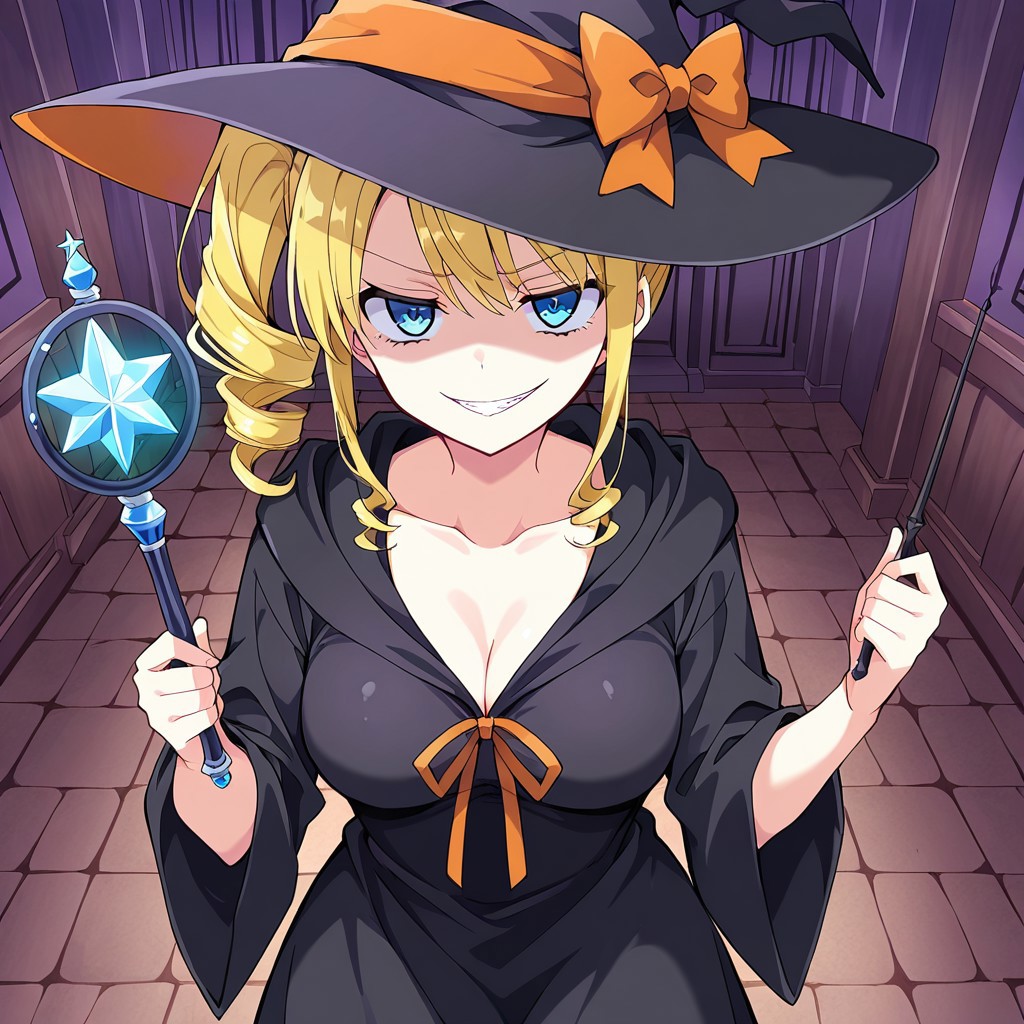 악마의 마법사: 포케갈, 047_magi, 금발, 사이드 포니테일, 드릴 머리, 파란 눈, 중간 크기 가슴