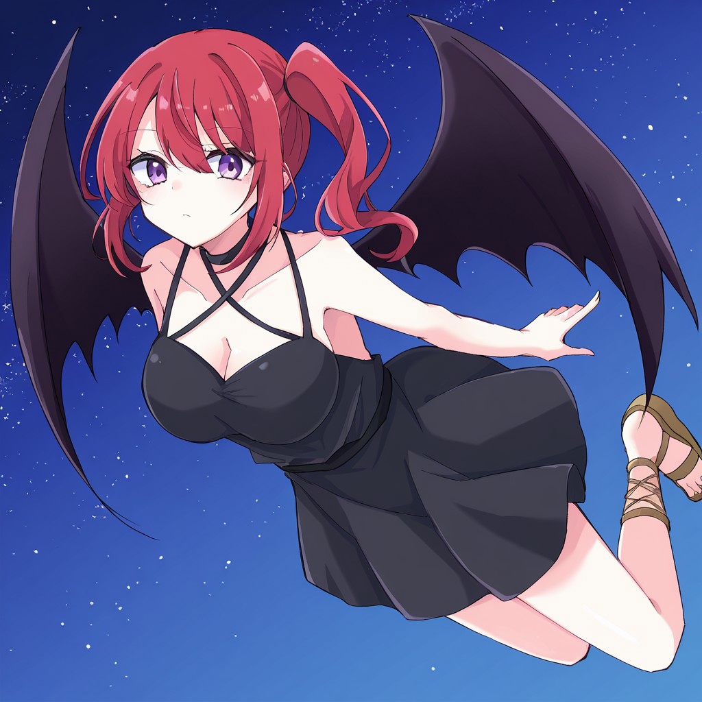 블랙 데빌: 포케갈, 044_an, 빨간 머리, 사이드 포니테일, 보라색 눈, 낙천사, 박쥐 날개, 큰 가슴