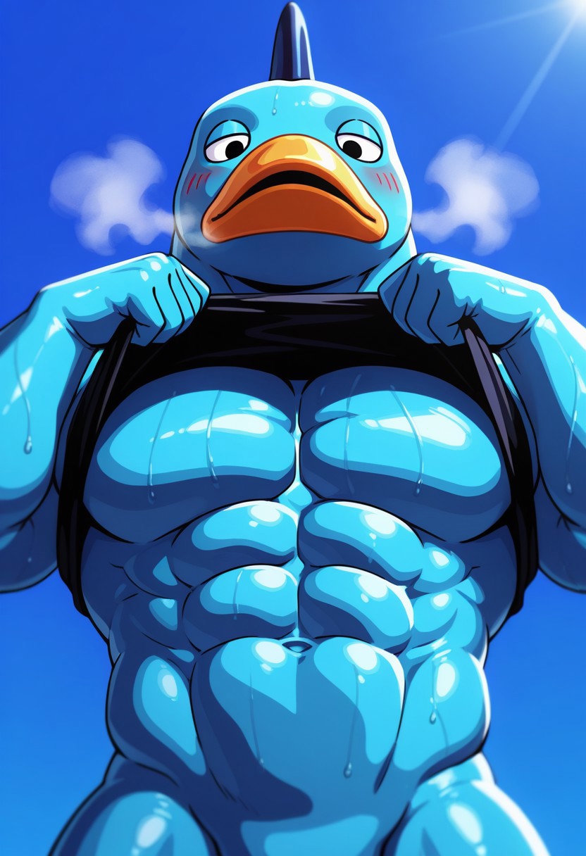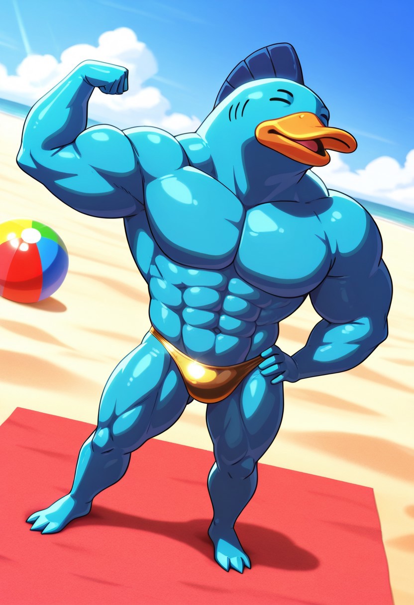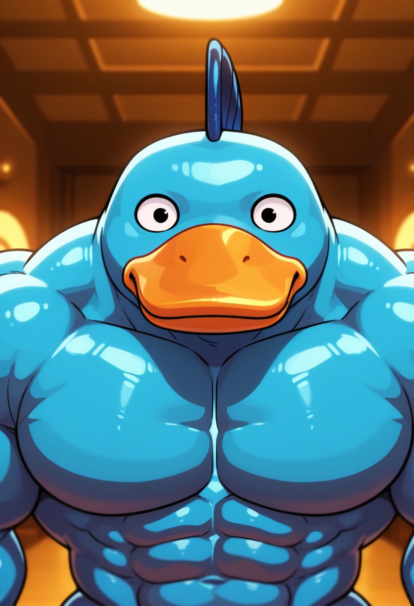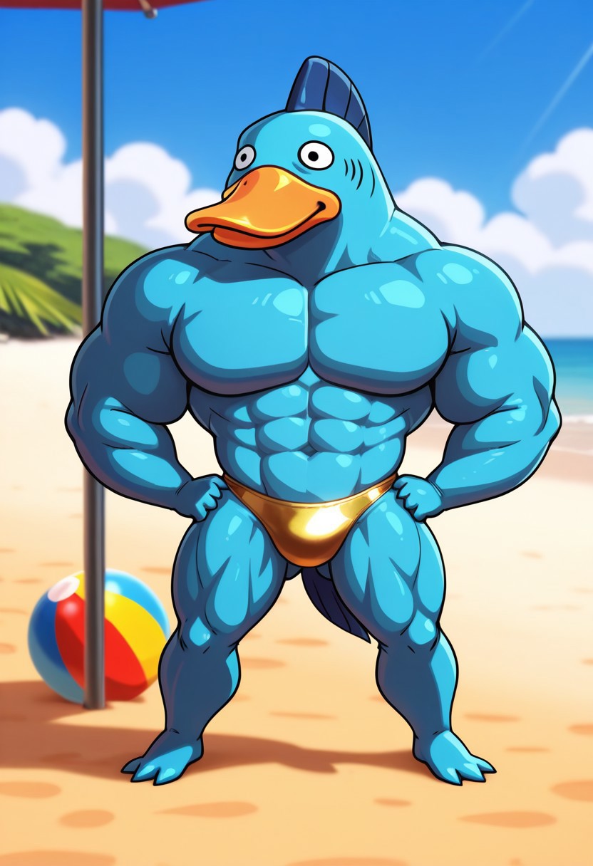 • 強化プロンプト: "フューリーな男性、オレンジ色のアヒルのくちばし、青い肌、濃い青の背びれ、尾、黒い目"