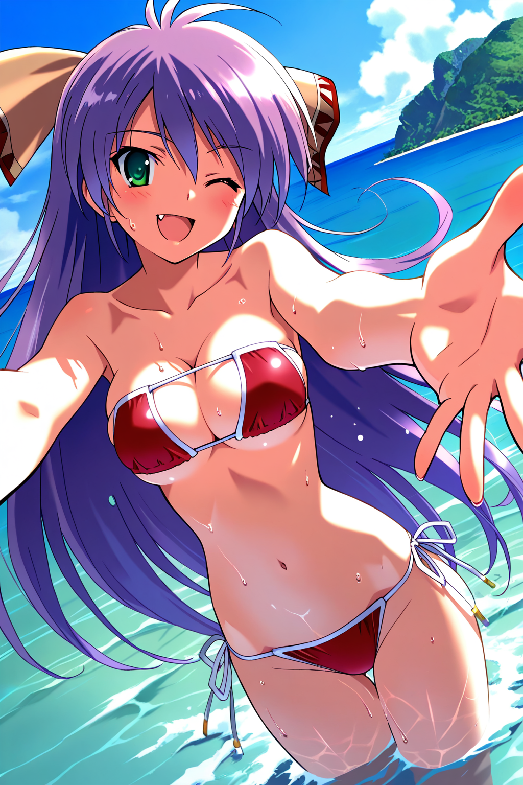 faury_swm, aoiumi_faury, 1girl, solo, 緑の目, 紫の髪, 長い髪, 中程度の胸, 髪リボン, 胸元, 赤いビキニ, 赤いサイドタイ ビキニパンツ,