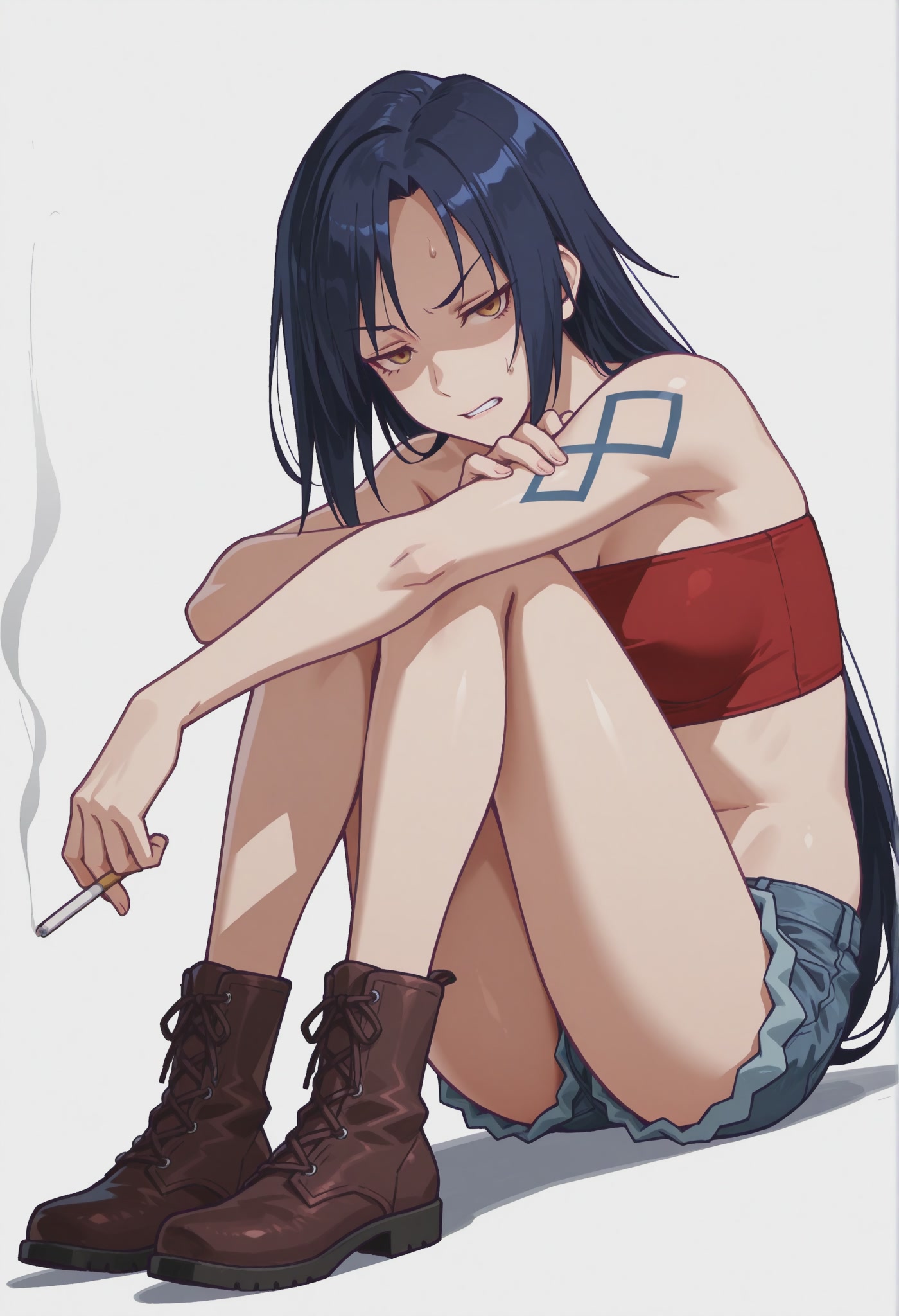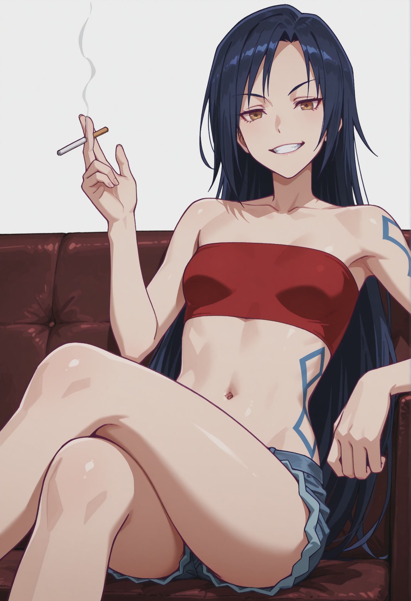 타투, 빨간 튜브탑, 데님 반바지,