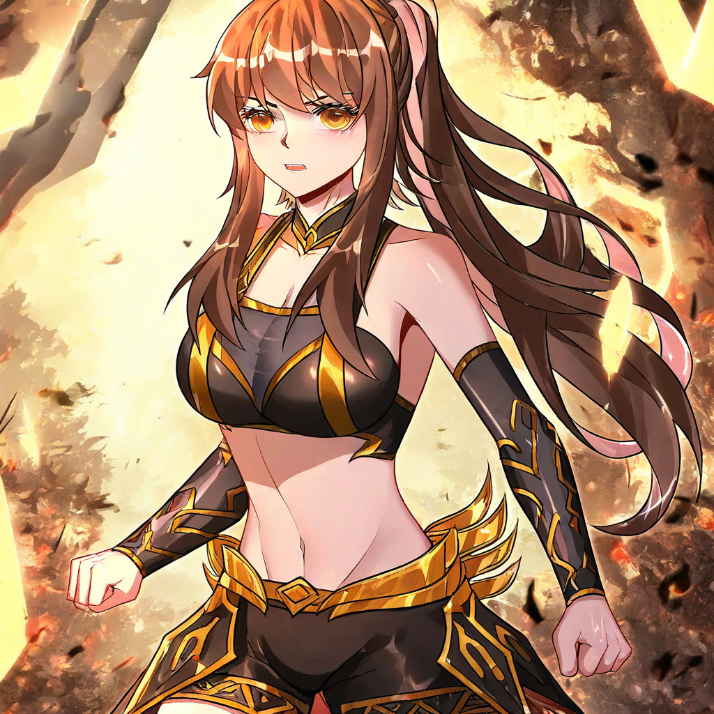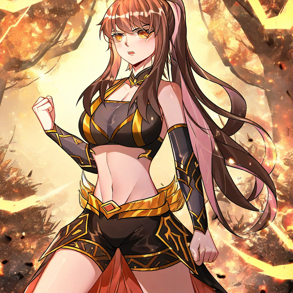 qianfan, 1소녀, 풀샷, 갈색 머리, 포니테일, 긴 머리, 머리 장식, 검은 장갑, 검은 바지, 노란 눈, 상의, 배꼽, 여자 생식기, 허벅지, 큰 가슴, 젖꼭지, 유륜,