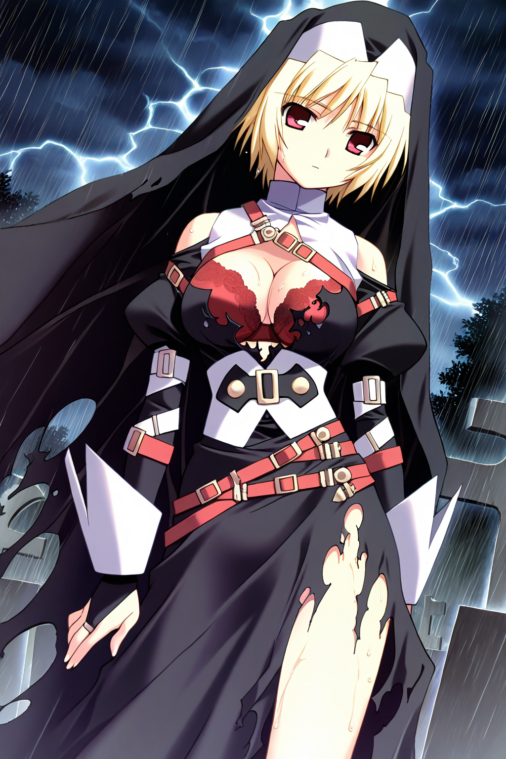 black veil, torn veil, white turtleneck, black dress, torn dress, side slit, bare shoulders, cleavage cutout, red lace-trimmed bra, puffy detached sleeves, long sleeves, sleeve cuffs, bridal gauntlets, buckle, multiple belts, loose belt, red belt, white belt, white armored boots,