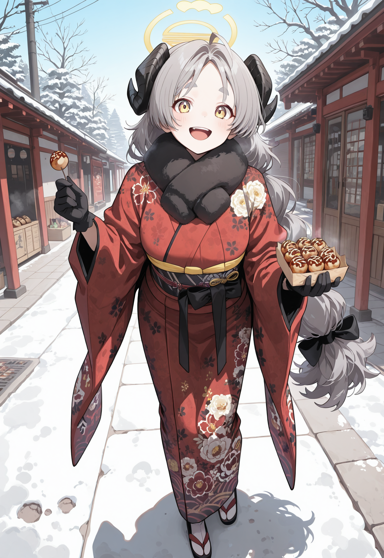 izumi ny,grey hair,yellow eyes,halo,red kimono,thick eyebrows,gloves,demon horns,low-tied long hair,hair bow,obi,print kimono,white socks,tabi,