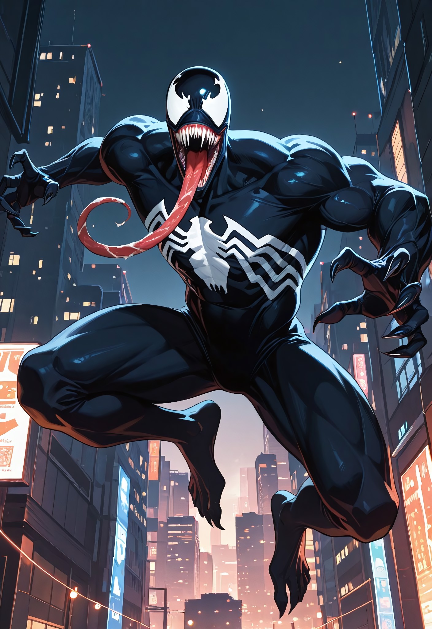 venom1992_(comics)IL, symbiote, body suit, black suit, monsterboy, 1boy, solo, spider print,, mouth, sharp teeth, long tongue, claws, muscular,