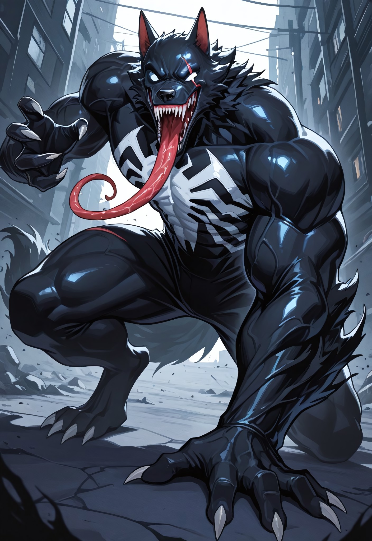 venom1992_(comics)XL, symbiote, body suit, black suit, monsterboy, 1boy, solo, spider print,, mouth, sharp teeth, long tongue, claws, muscular,