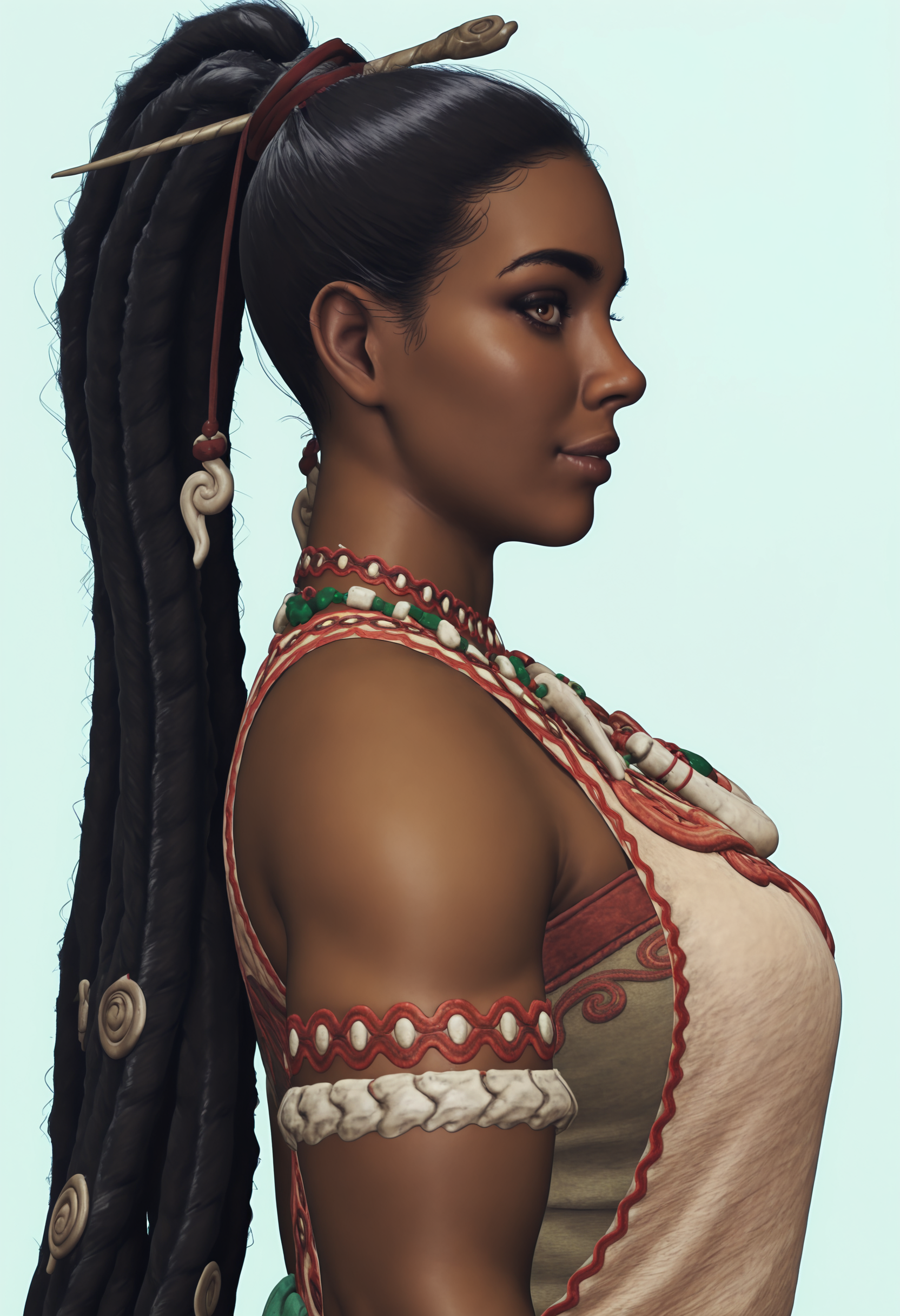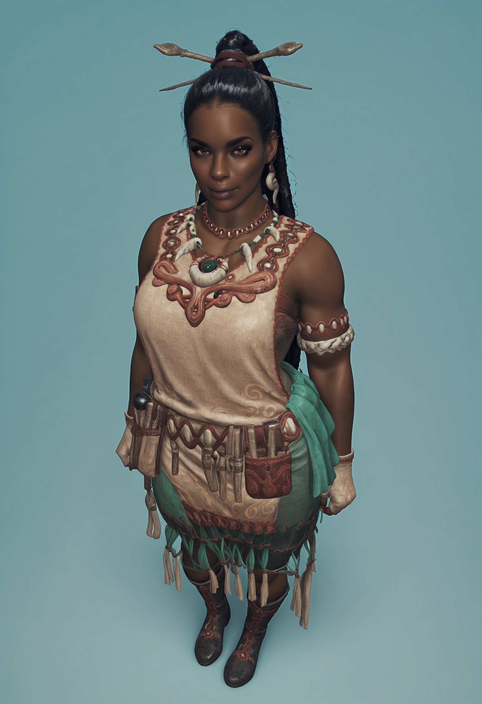 • aidailf、肌の黒い女性、黒髪、ダレロック、茶色の目、ノースリーブ、ネックレス、髪飾り、スカート、フィンガーレスグローブ