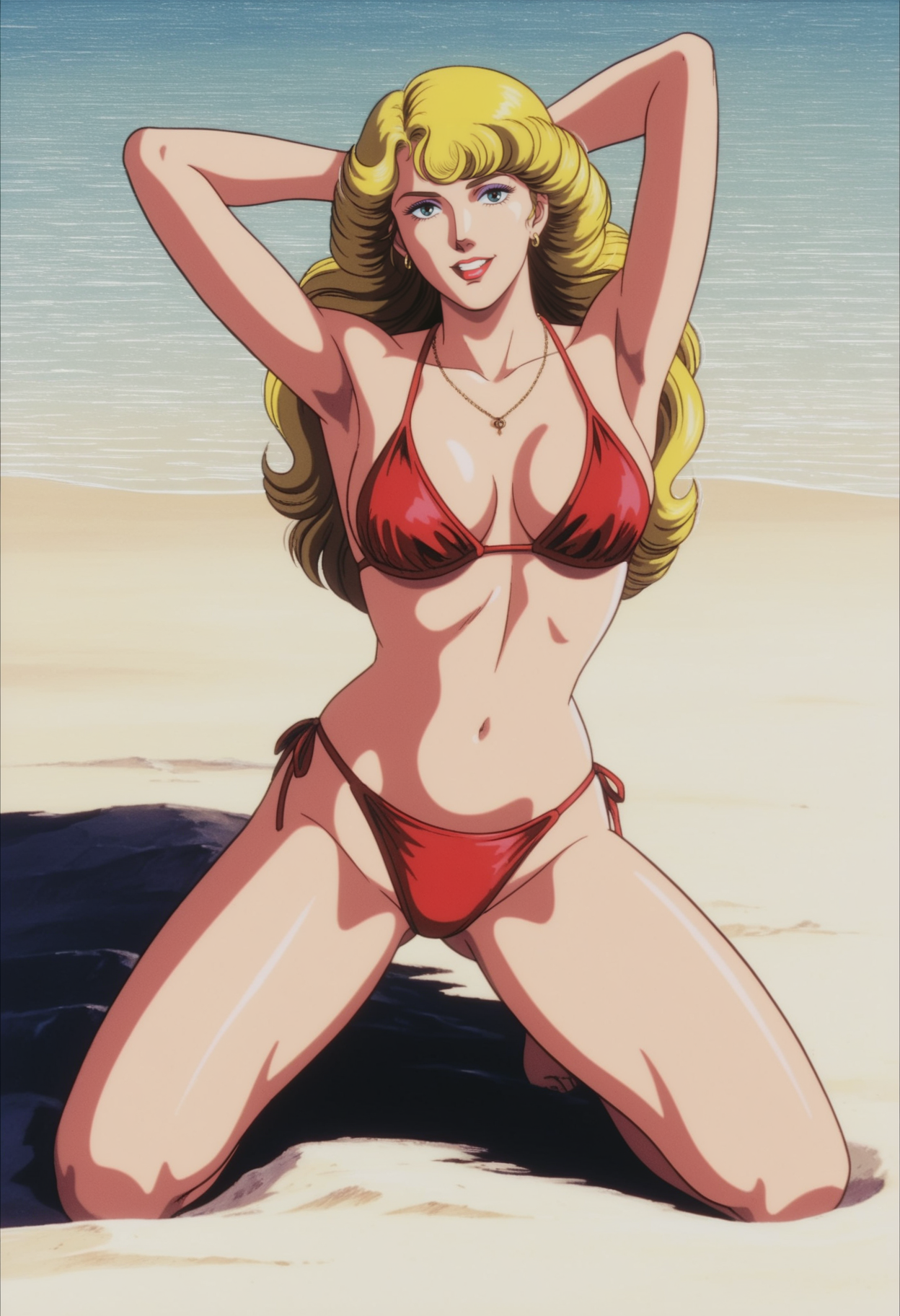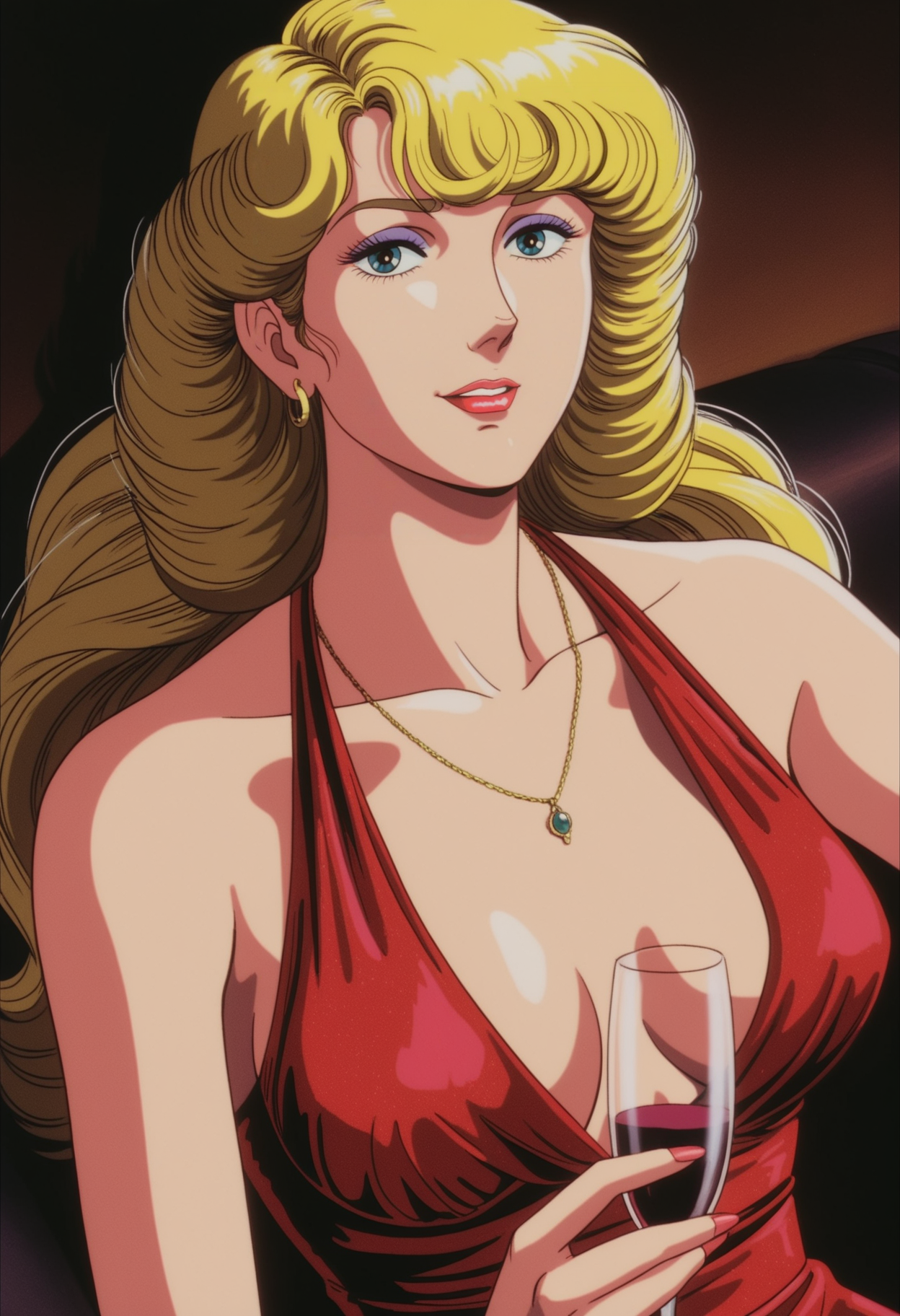1girl,solo,retro artstyle,anime coloring,blonde hair,long hair,blue eyes,lipstick,purple eyeshadow,medium breasts,earrings,necklace