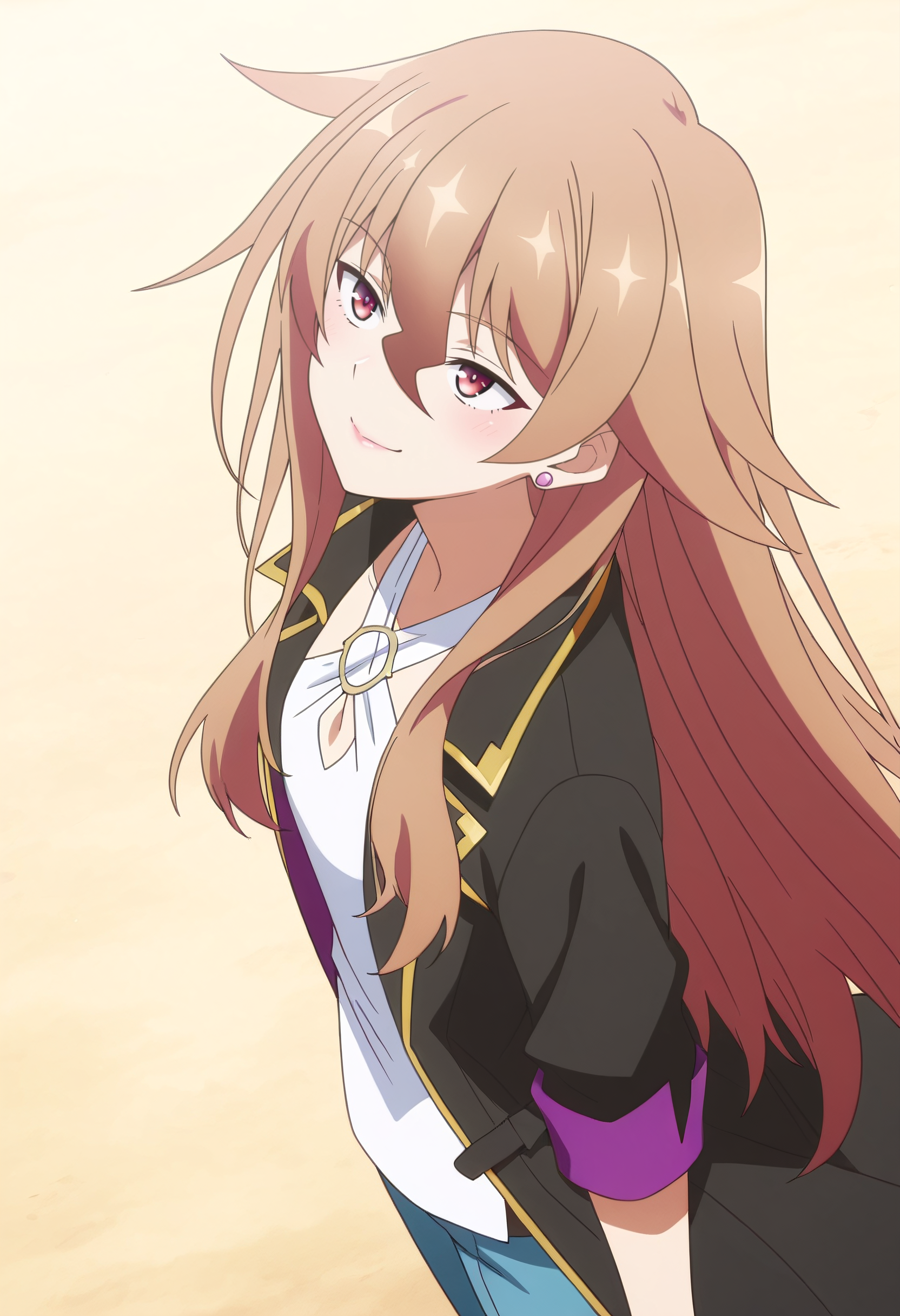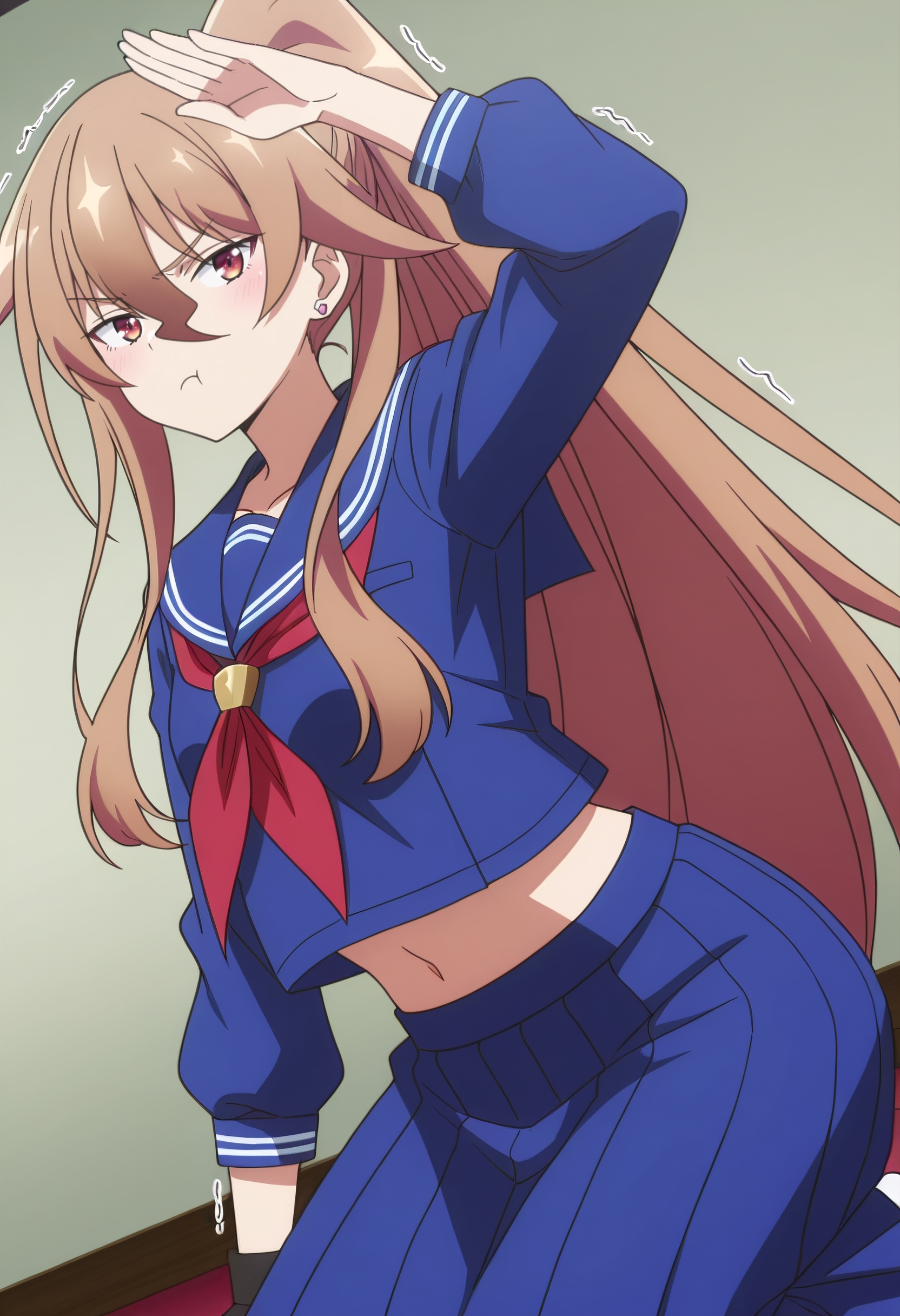 HulemySchool、学校制服、セーラー服、ポニーテール、セーラー collar、赤いネクチーフ、ネクチーフ、スカート、プリーツスカート、長袖、青いスカート、青いセーラー服、シャツ、青いセーラーカラー、長いスカート、腹部、高いポニーテール、手袋、指なし手袋、黒い手袋、イヤリング、ジュエリー、片手のみの手袋、非対称手袋、スタッドイヤリング、腹部のぞき見、へそ