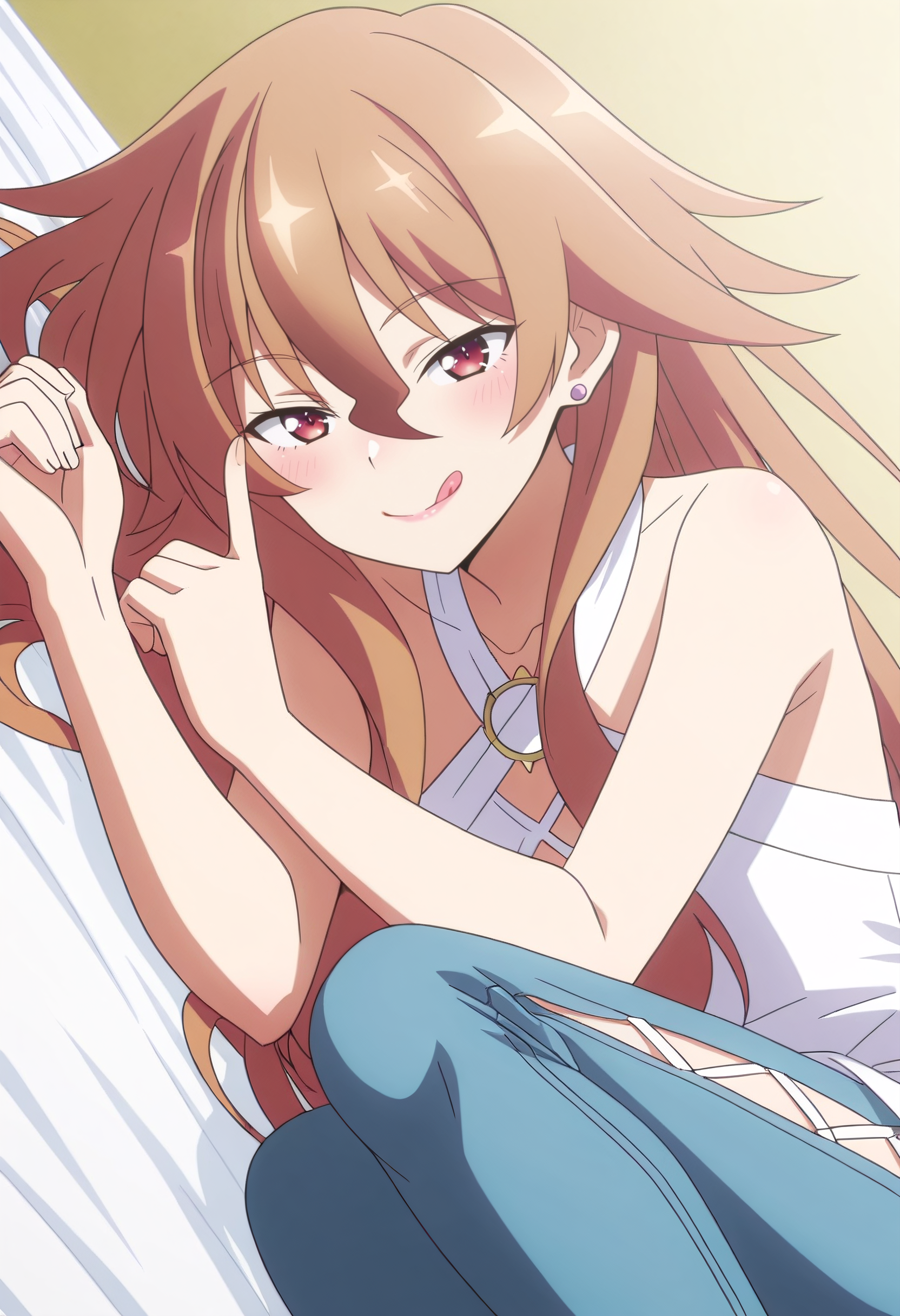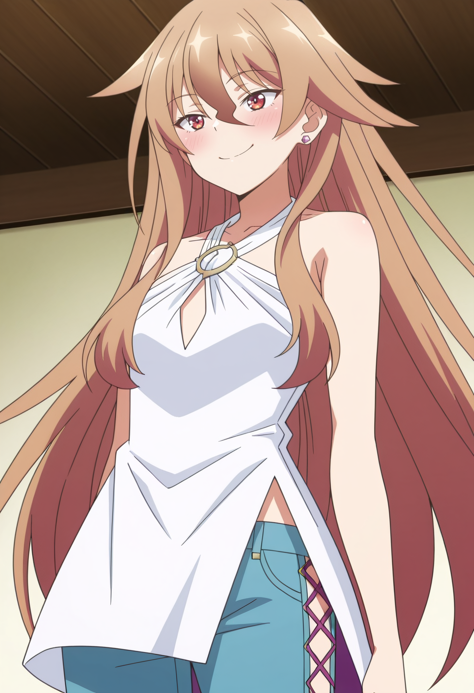 HulemyShirt、肩出し、ジュエリー、鎖骨、ドレス、イヤリング、ハーネック、白いドレス、ノースリーブ、ズボン、青いズボン、ジーンズ、クロスハーネス、ノースリーブドレス、腕出し、Oリング、デニム、クロスレーススリット、ヒップベンチ