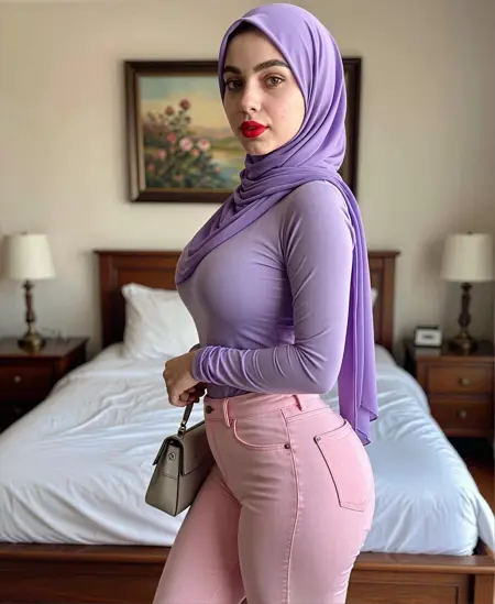이것은 여성이 거울 앞에서 셀카를 찍는 모습을 촬영한 중간 근접, 암시적인 사진입니다. 그녀는 단색의 밝은 벽에 서 있으며, 자연광이 부드러운 그림자를 만듭니다. 그녀는 히잡과 베이지색 두 벌짜리 옷을 입고 있으며, 이 옷은 낮은 컷의 브라레트와 하이웨이스트 쇼츠로 구성되어 그녀의 곡선적인 체형과 풍성한 가슴을 강조합니다. 그녀는 오른손에 검은 스마트폰을 들고 있습니다. 조명은 자연광입니다. 전반적인 스타일은 현대적이고 미니멀리즘적이며, 주인공의 자연스러운 아름다움과 자신감 있는 자세를 강조합니다.