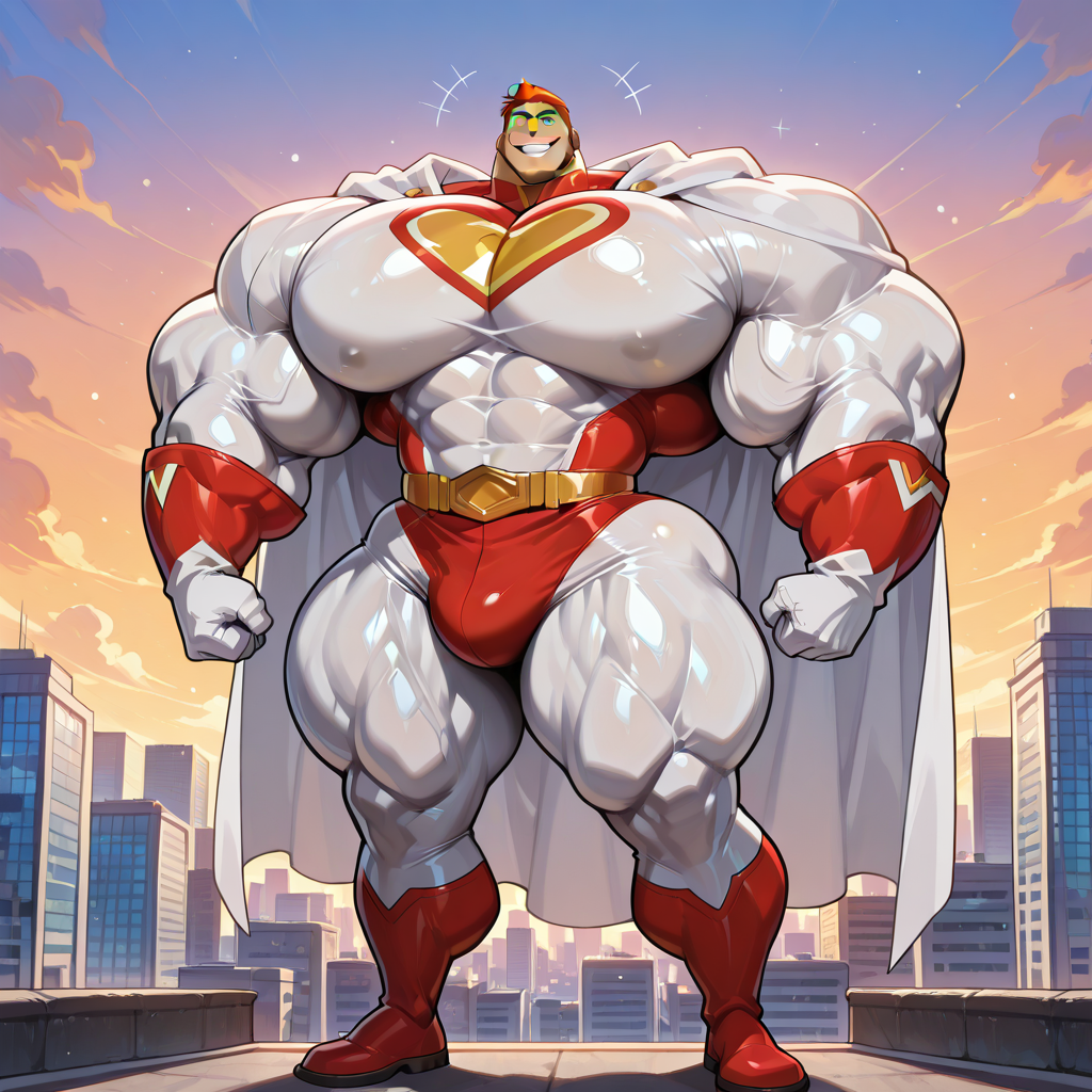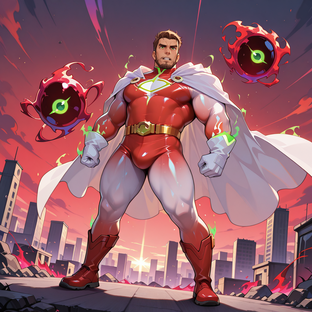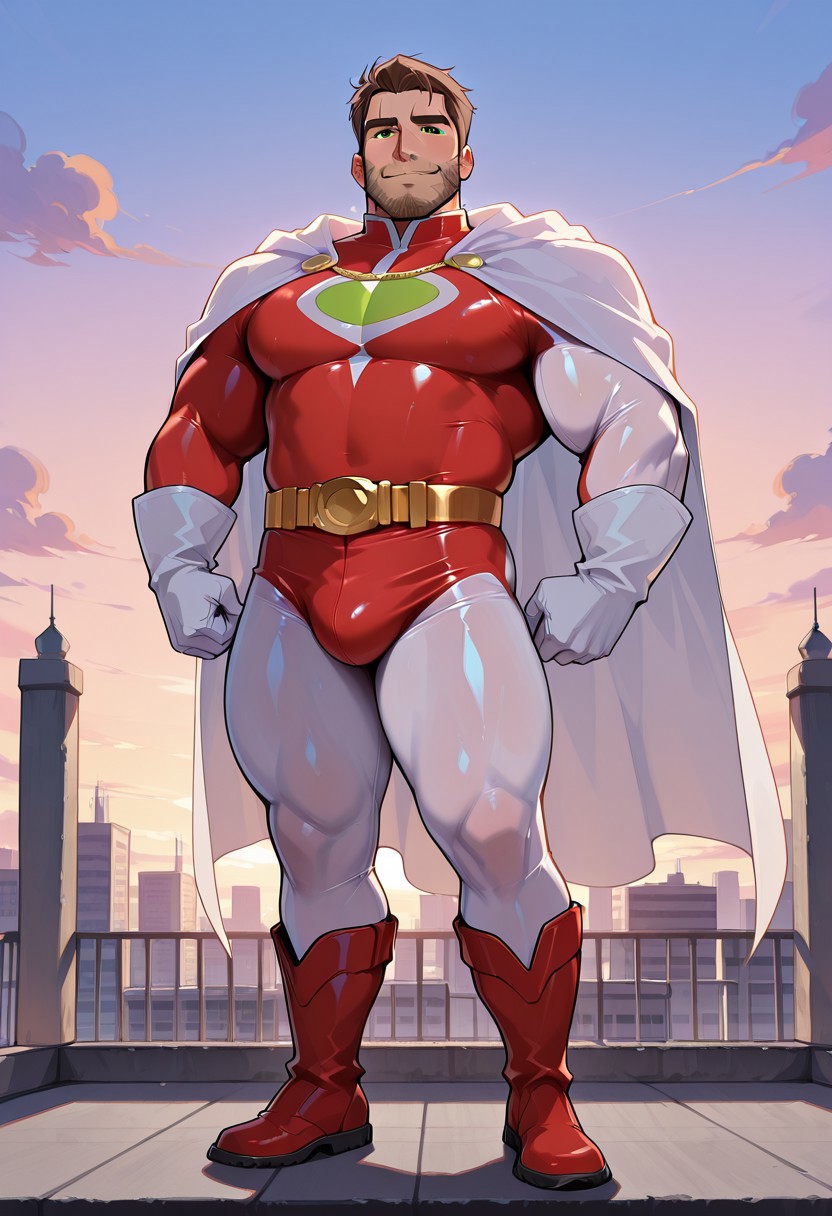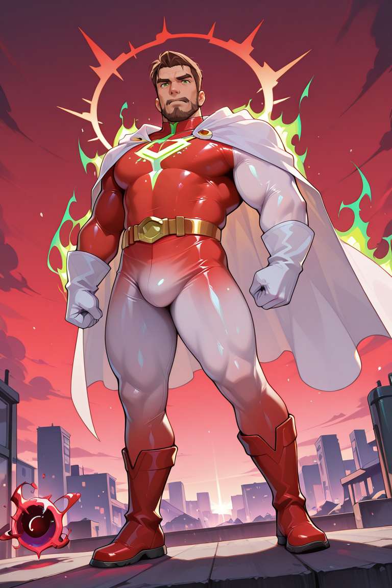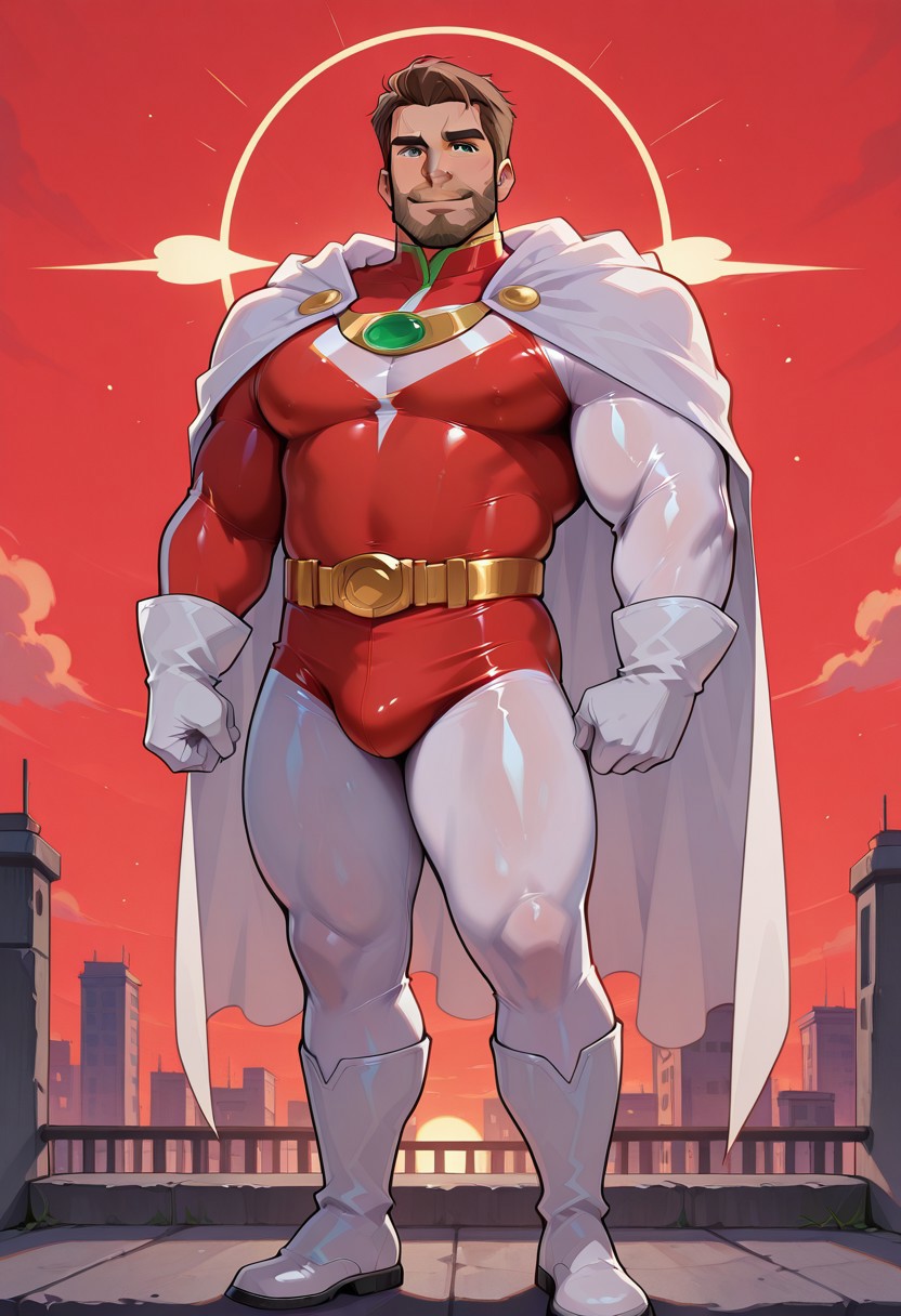 McCain, 1man, male, mature male, bulky, brown hair, green eyes, red bodysuit, white bodysuit, two-toned bodysuit, white gloves, gold belt, red underwear, white cape, red boots,