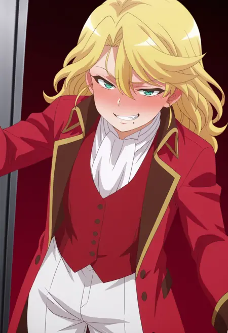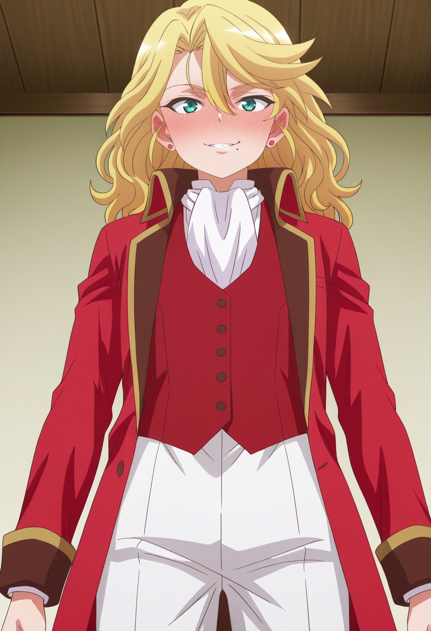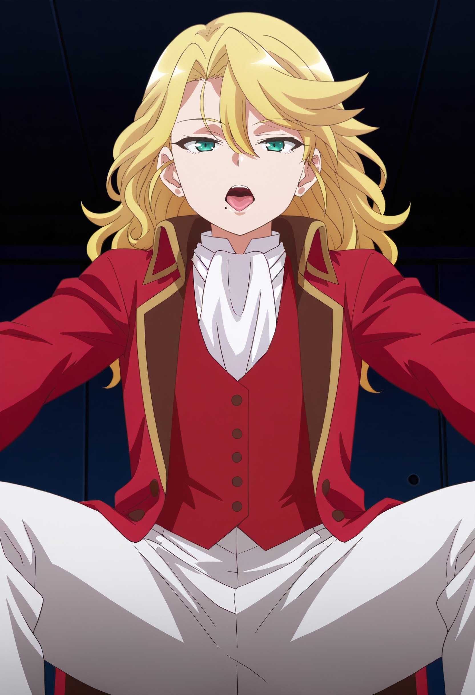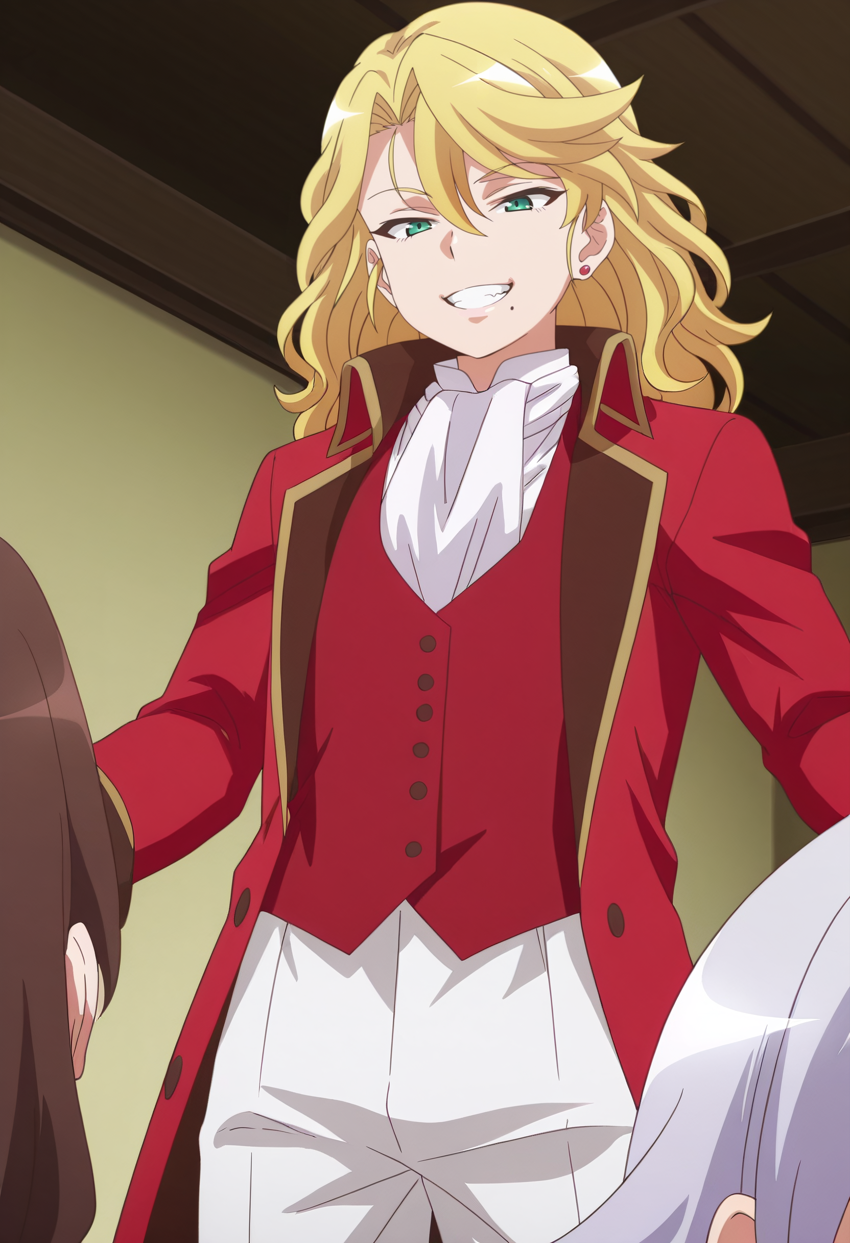 DirectorOutfit、アスコット、イヤリング、白いアスコット、ジャケット、ジュエリー、赤いジャケット、男性中心、コート、赤いコート、ベスト、スタッドイヤリング、長袖、ズボン、白いズボン、赤いベスト、高めの襟、フォーマルな服、ウェストコート、開いたジャケット、開いた服