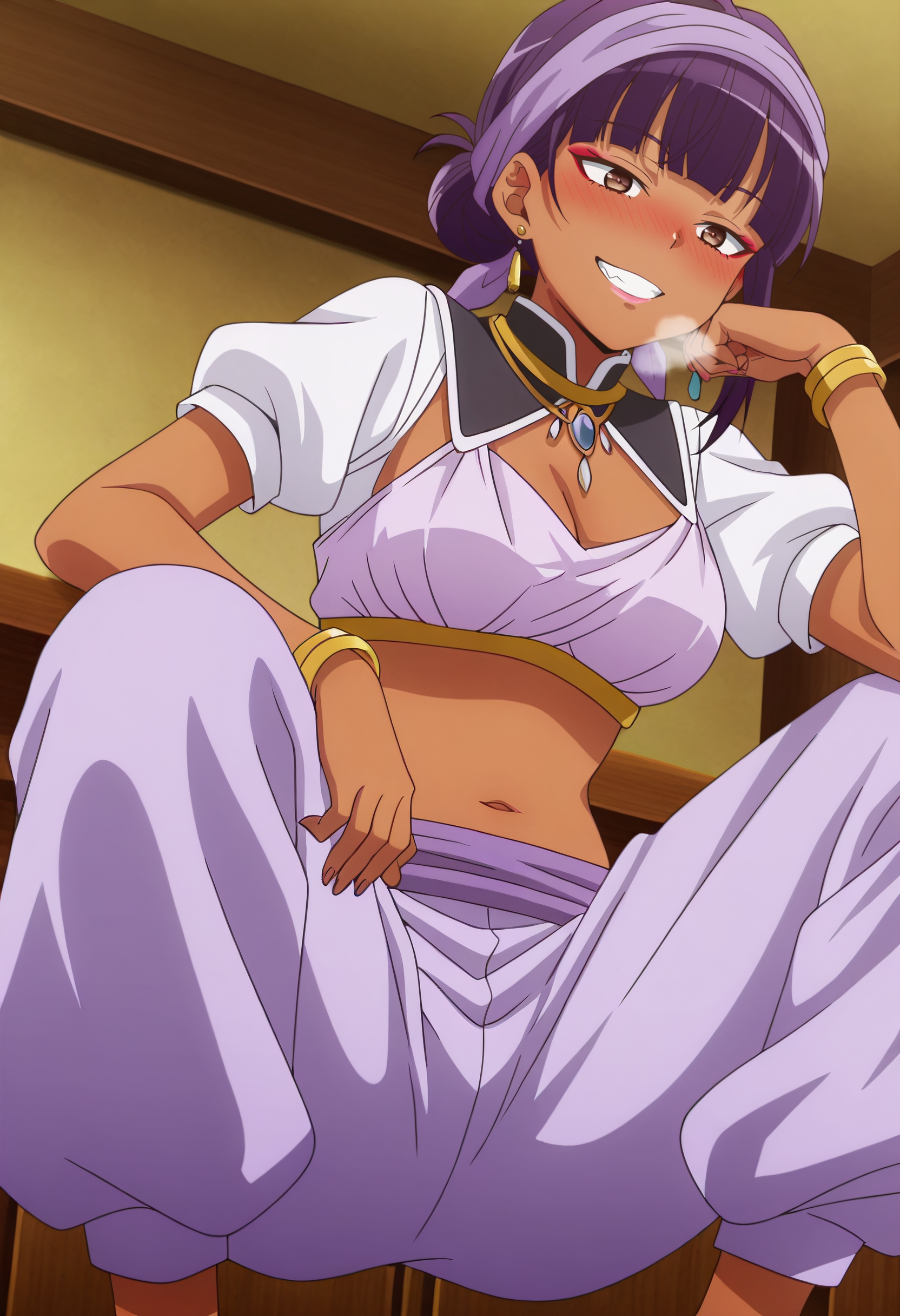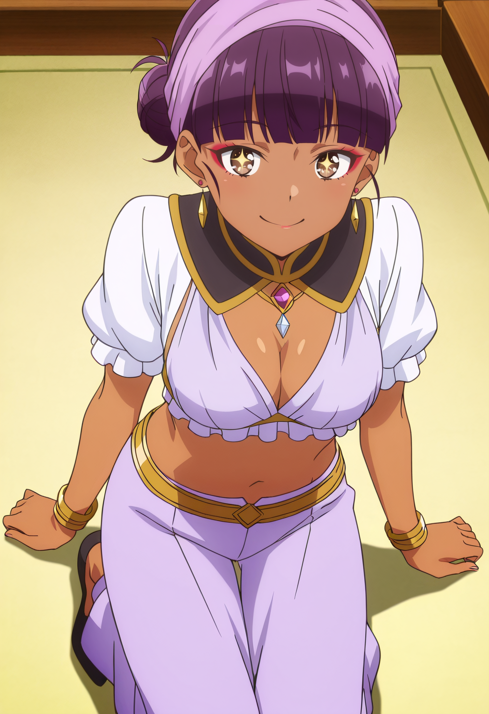 MerchantOutfit、ジュエリー、バンダナ、ズボン、短袖、紫のズボン、胸元の露出、お腹の露出、イヤリング、ブレスレット、ショートトップ、ヘアバンド、ネックレス、ヘッドバンド、ふくらはぎの膨らんだズボン、ふくらはぎの膨らんだ袖、ゆったりしたズボン、