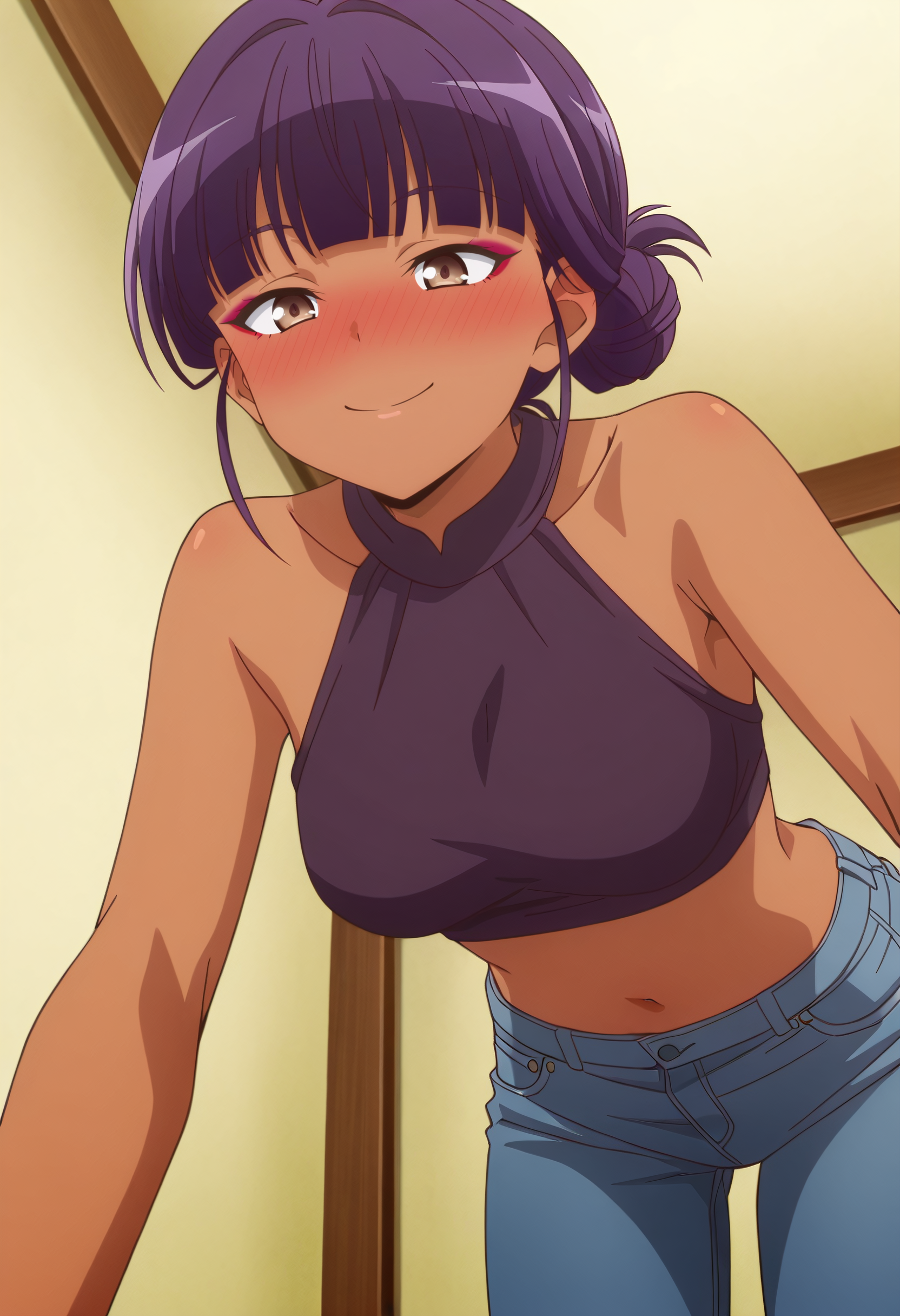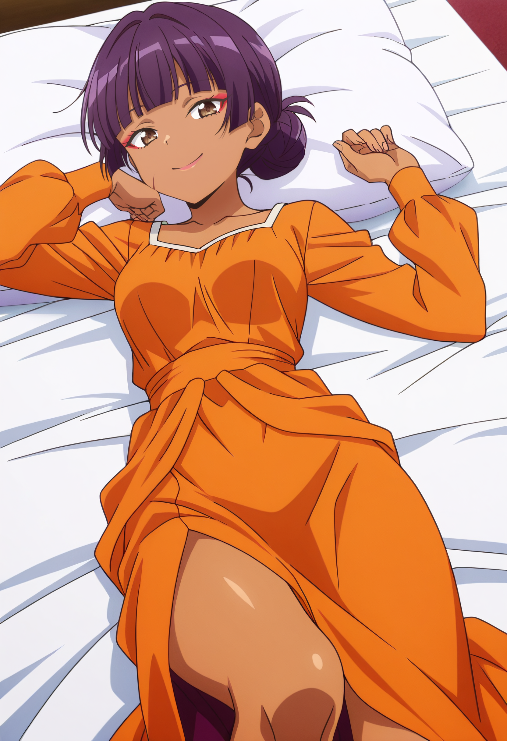 JHNMerchant、紫髪、短髪、ストレートな前髪、片側の髪の結び目、髪の結び目、茶色の目、肌の黒い女性、濃い肌、化粧、アイシャドウ、アイライナー、