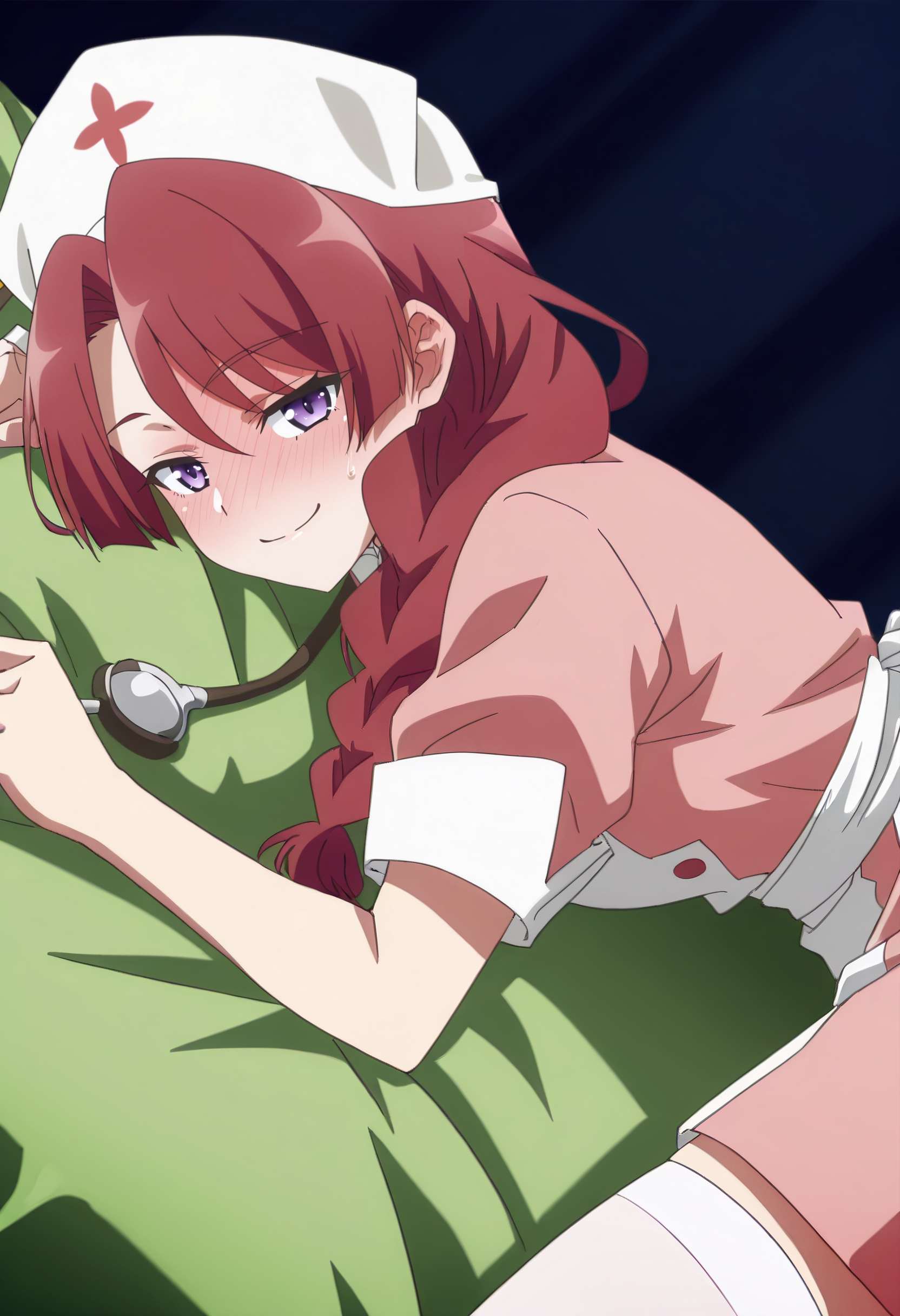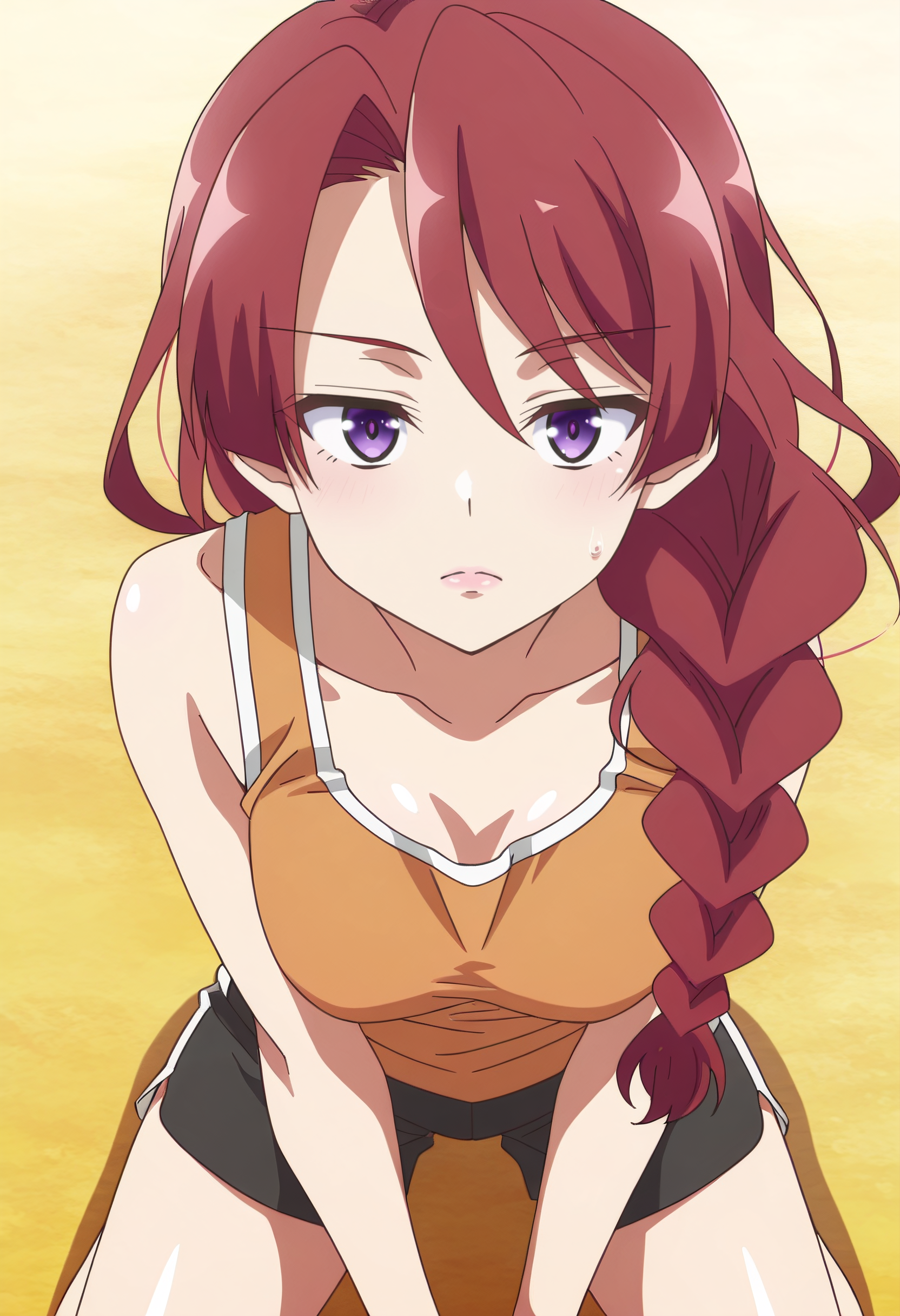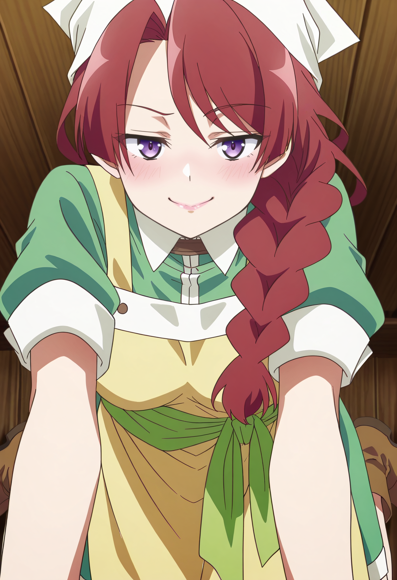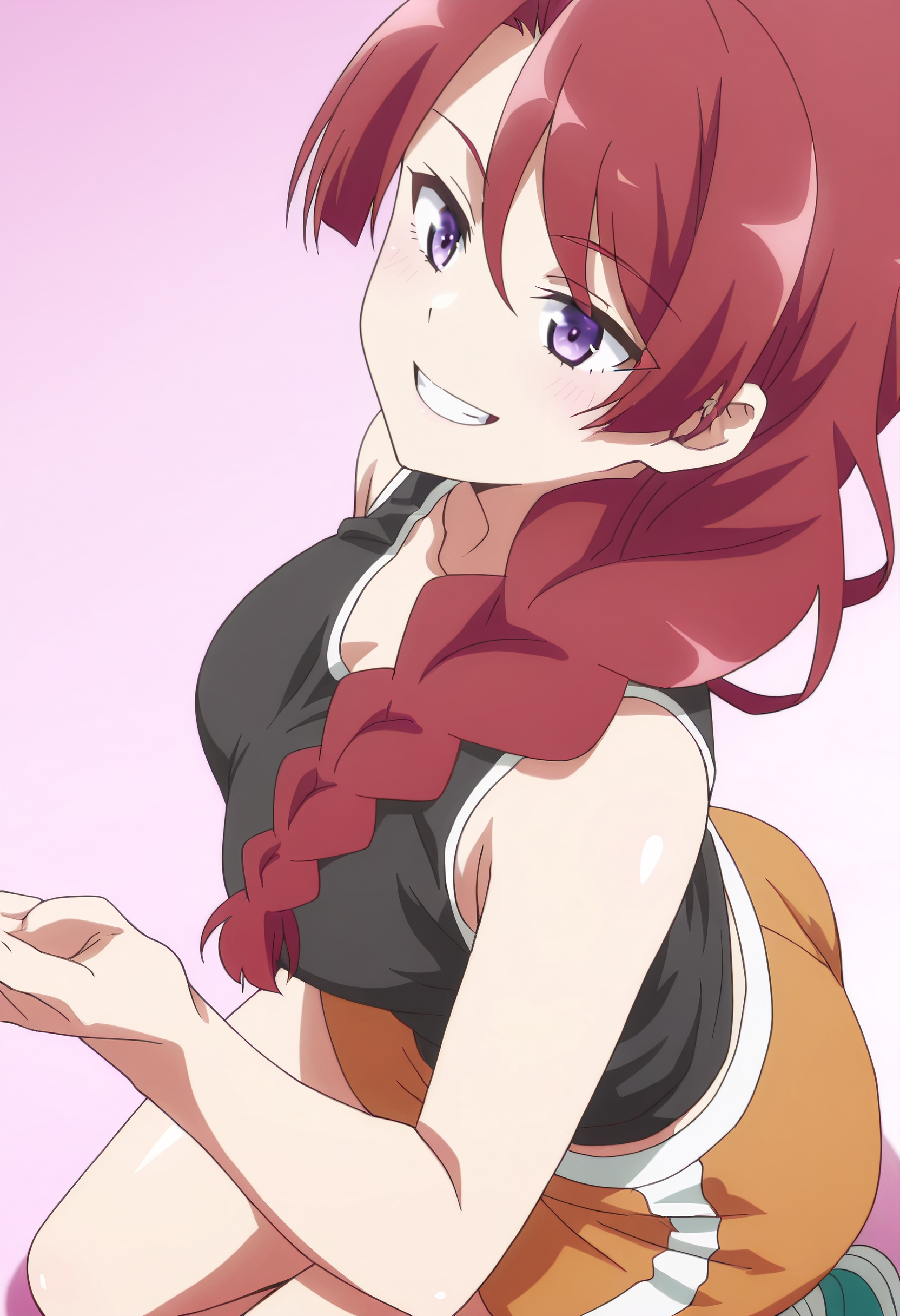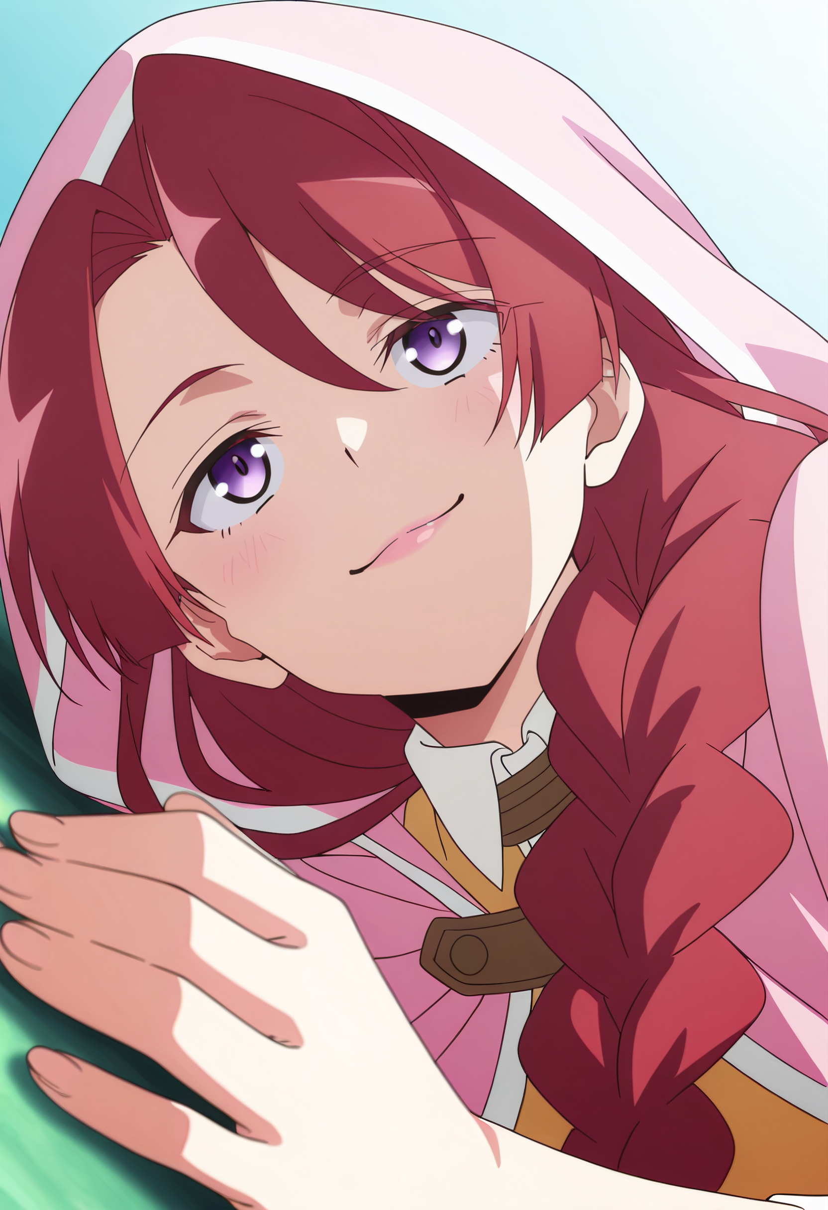 JHNMunami、長い髪、赤髪、編み込み、茶髪、肩にかかる髪、片側編み込み、紫の目、編み込みポニーテール、