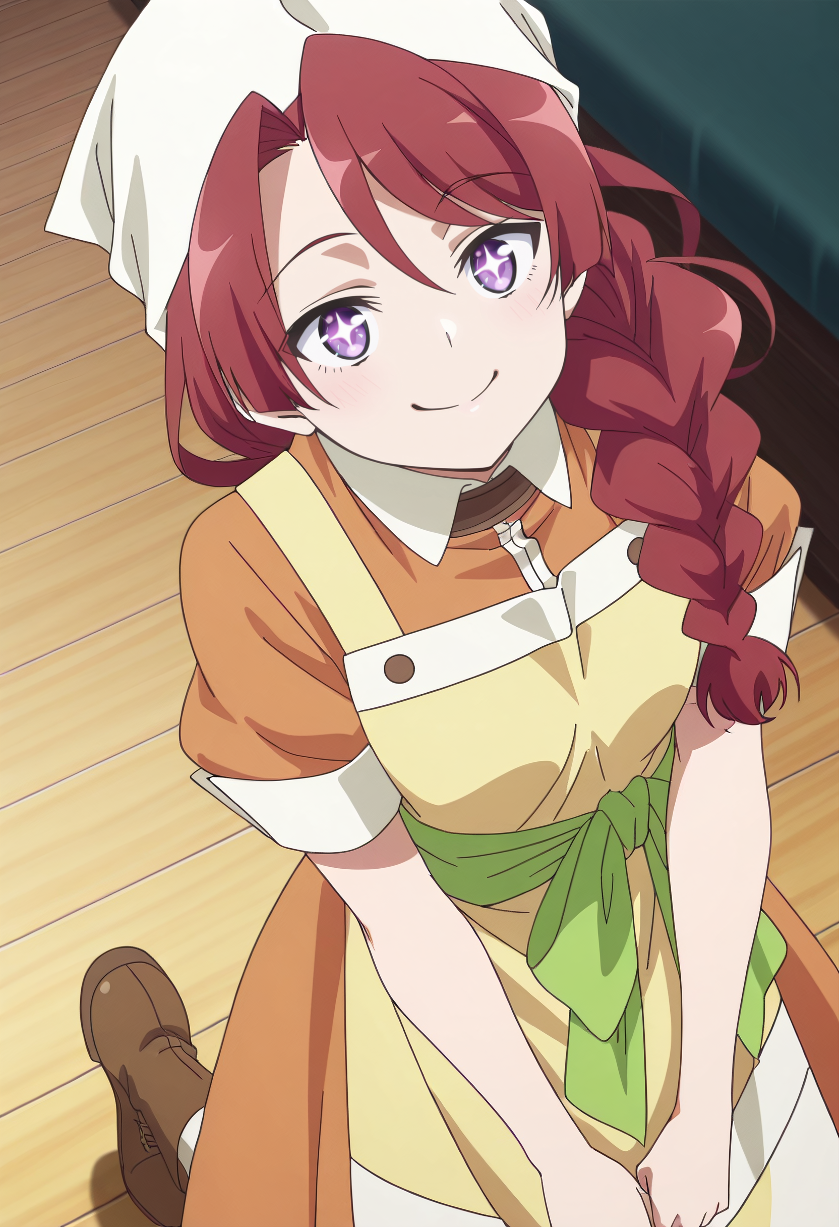 MunamiOutfit、エプロン、頭巾、黄色のエプロン、短い袖、バンダナ、ドレス、帽子、オレンジのドレス、ふくらはぎ袖、緑のバンダナ、茶色の靴、ブーツ、シャツ、