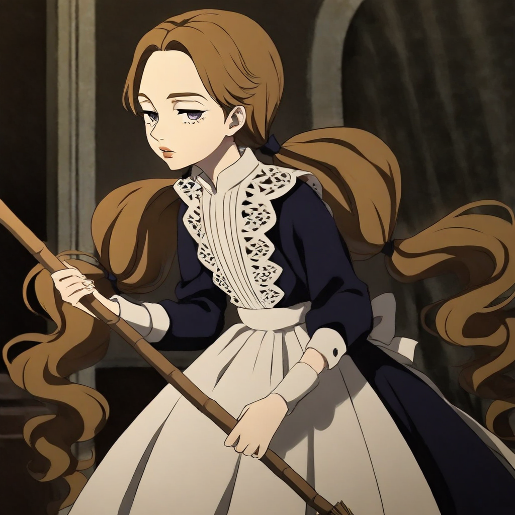 1girl, belle, belle eyes, belle hair, brown hair, long twintails, belle dress, apron