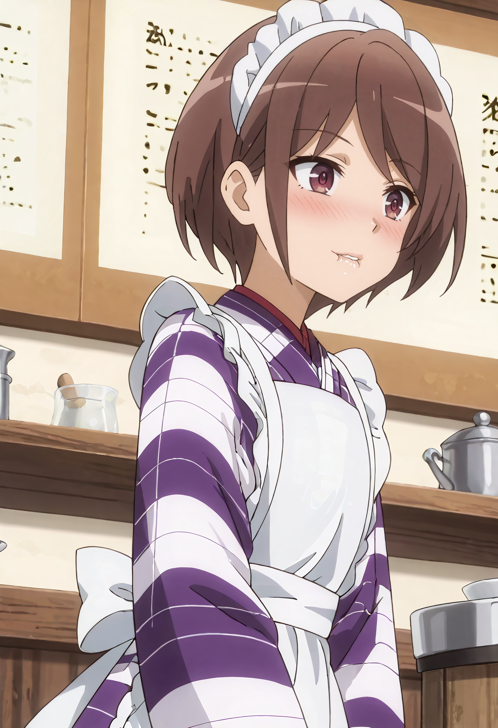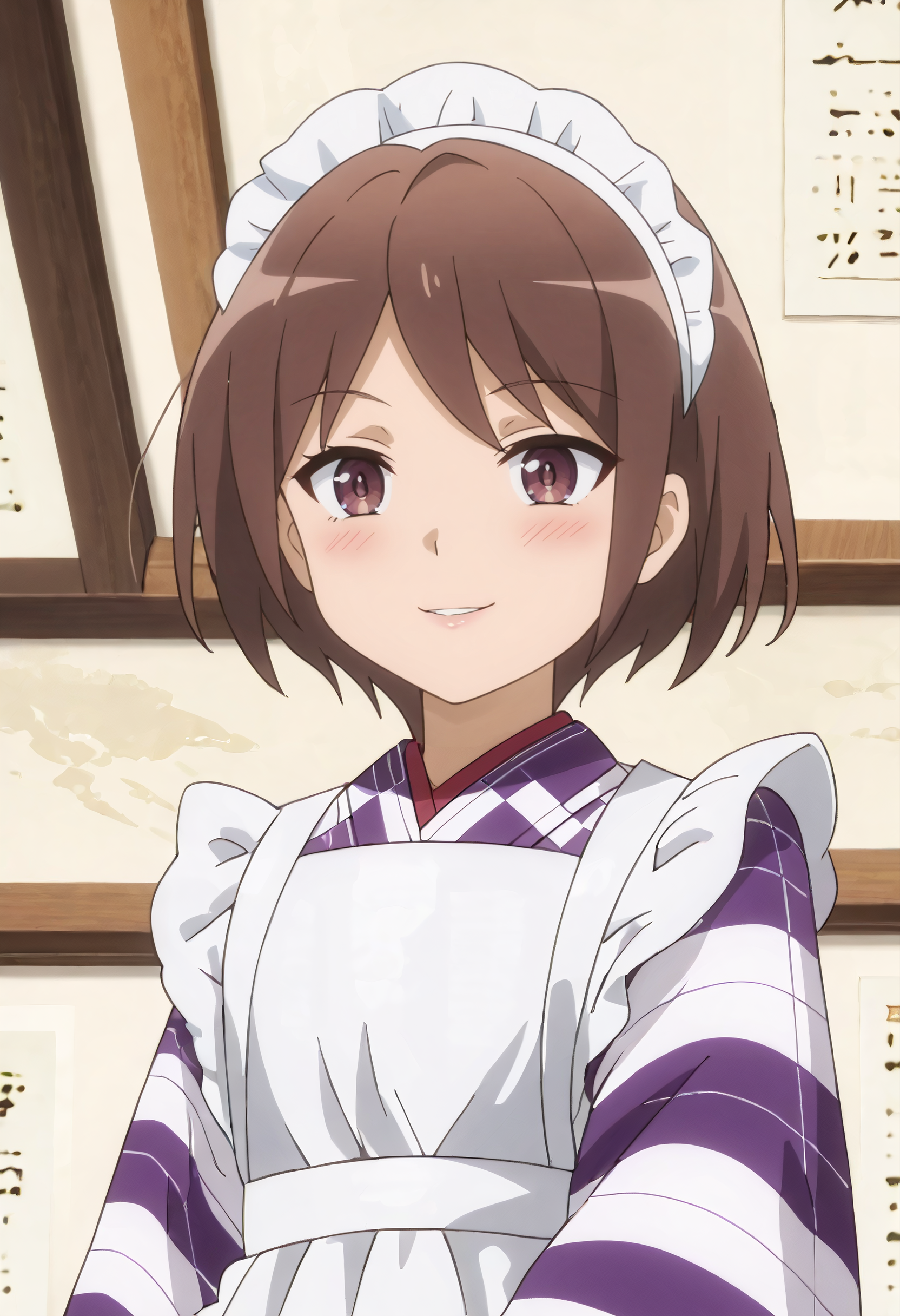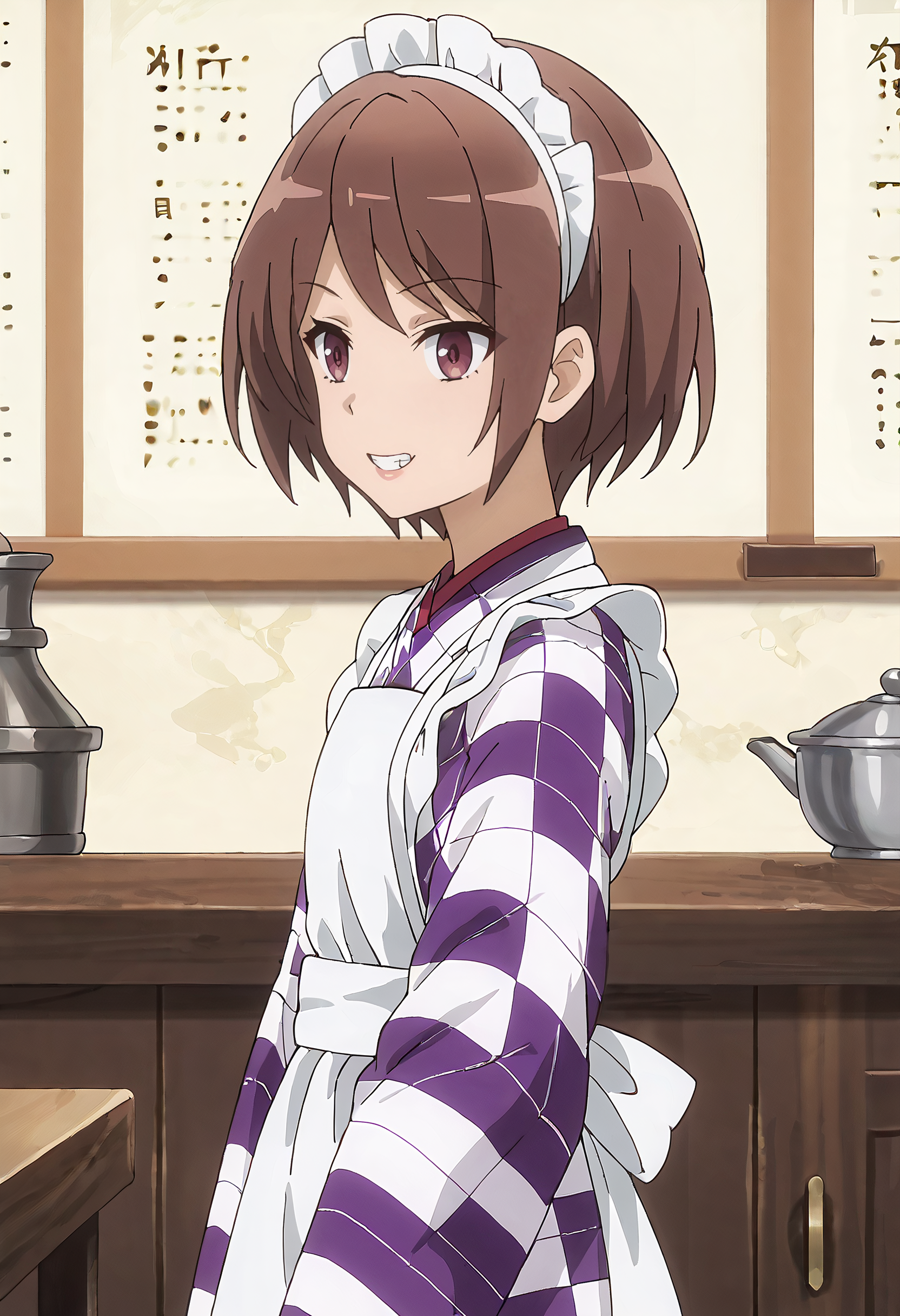 SulasOutfit, 앞치마, 김포, 일본 옷, 체크무늬 옷, 메이드, 흰색 앞치마, 프릴이 달린 앞치마, WA 메이드, 체크무늬 김포, 긴 소매, 보라색 김포, 넓은 소매, 메이드 앞치마, 프릴, 메이드 헤드기어,
