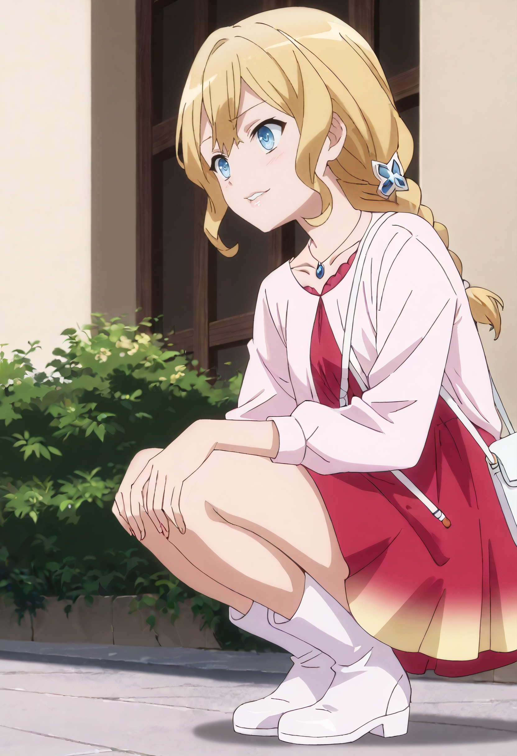 RelielOutfit, 보석, 목걸이, 긴 소매, 어깨뼈, 드레스, 분홍 드레스, 셔츠, 분홍 셔츠, 재킷, 펜던트, 빨간 드레스, 머리 장식, 그라데이션 옷, 다색 옷, 부츠, 흰색 신발,
