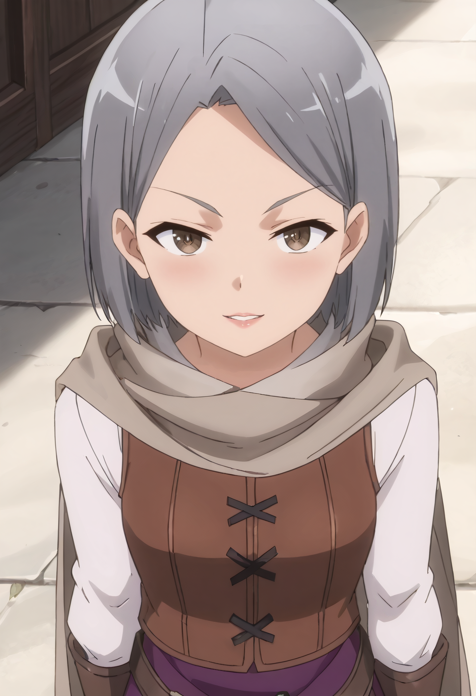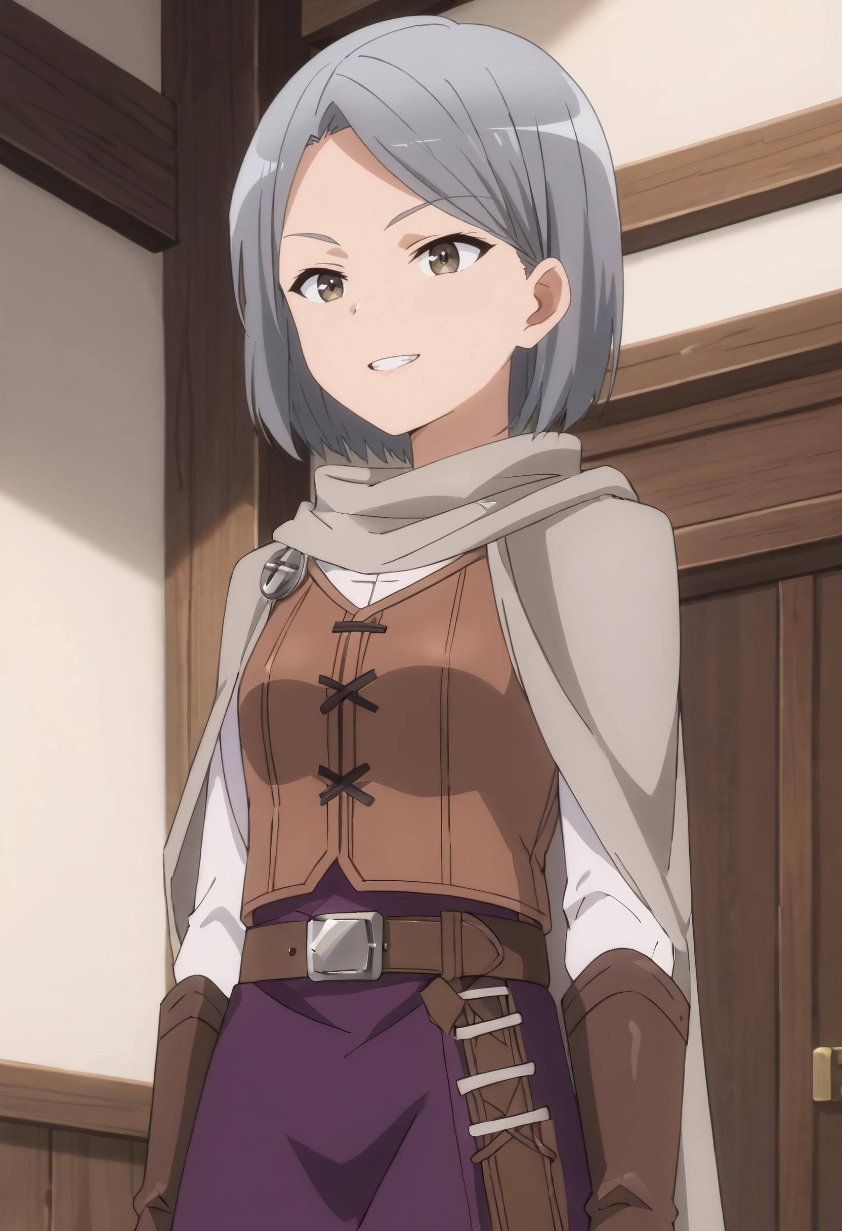 RebeccaOutfit, 망토, 케이프, 조끼, 긴 소매, 셔츠, 갈색 조끼, 스카프, 드레스, 장갑, 검은색 휘장, 회색 케이프, 치마, 갈색 장갑, 벨트, 보라색 치마, 갈색 벨트, 십자 끈으로 단 옷,