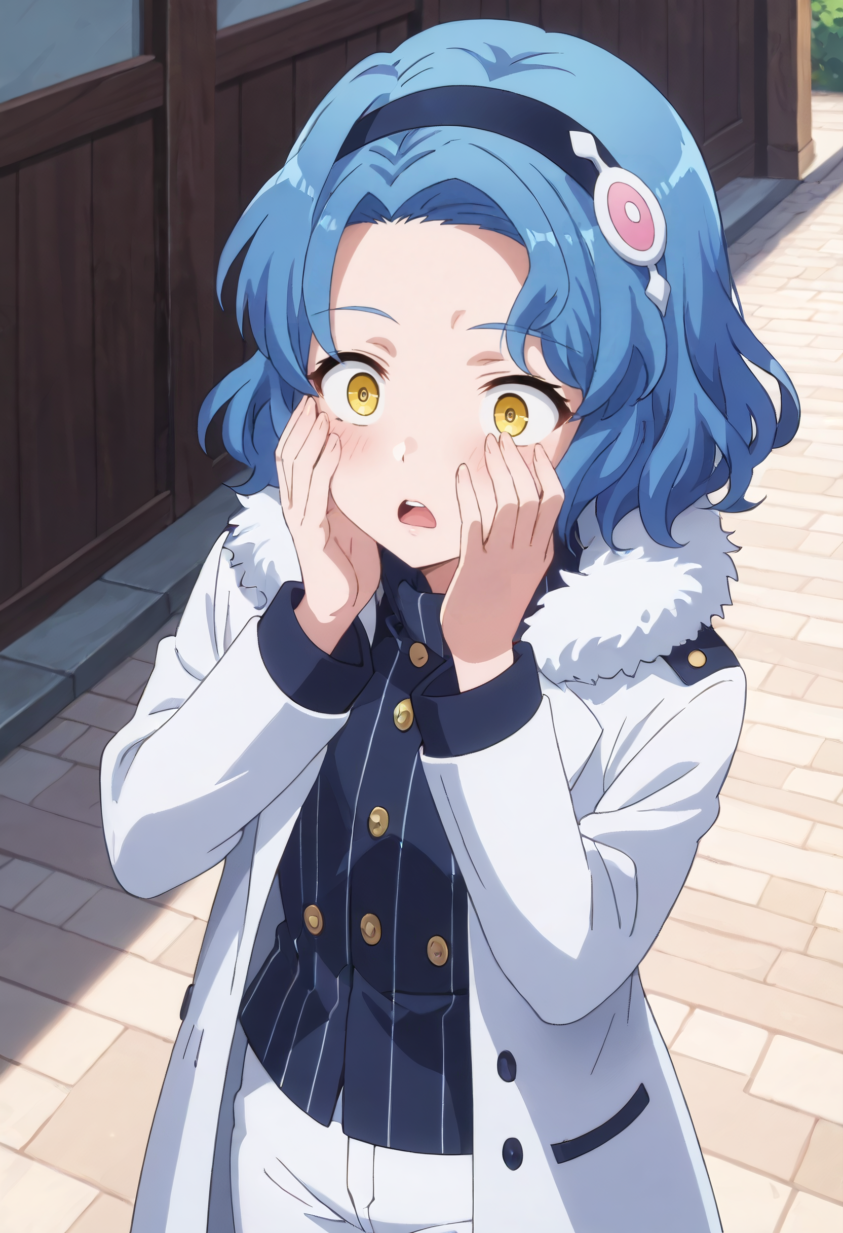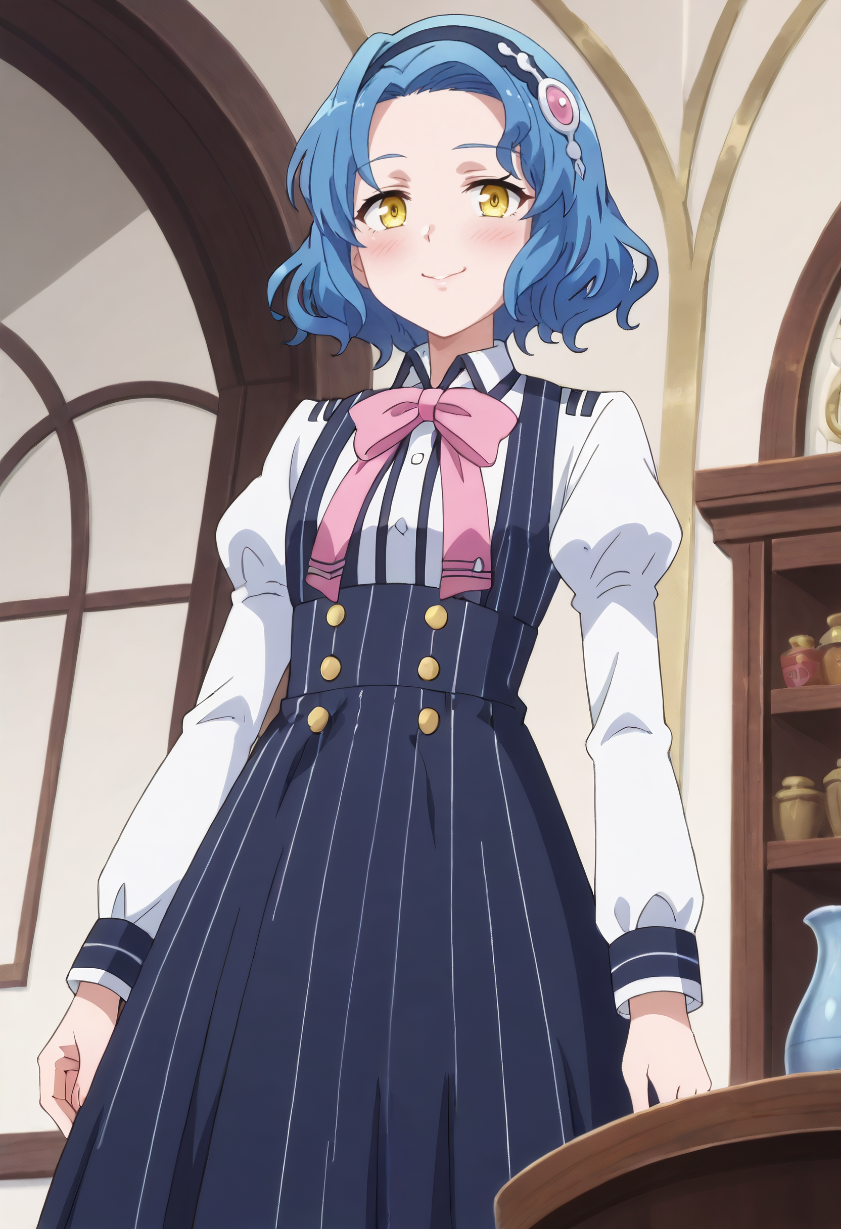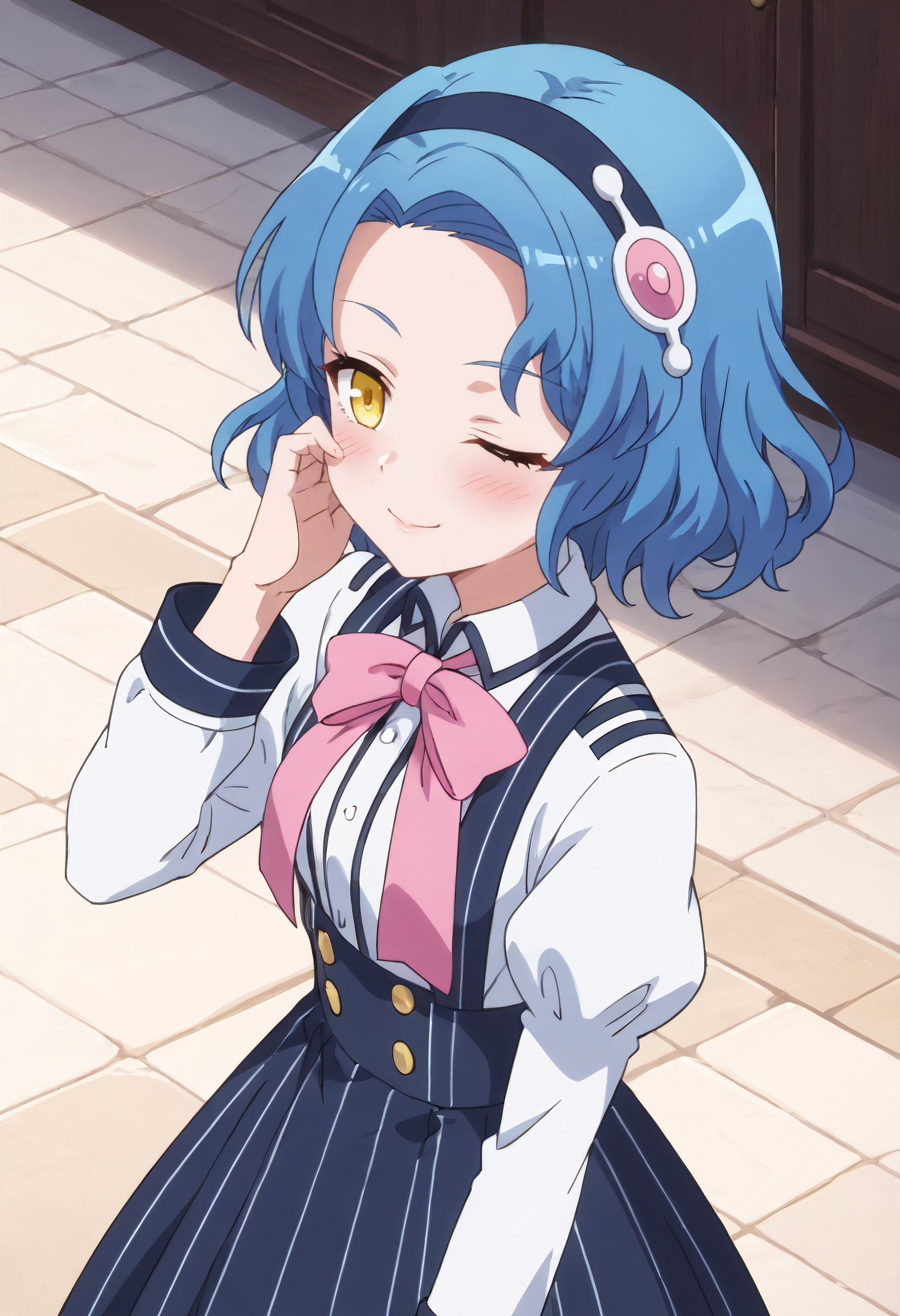 IAWPreliora, 파란 머리, 단발, 노란 눈, 갈라진 앞머리, 물결 모양 머리, 검은 머리끈, 이마,