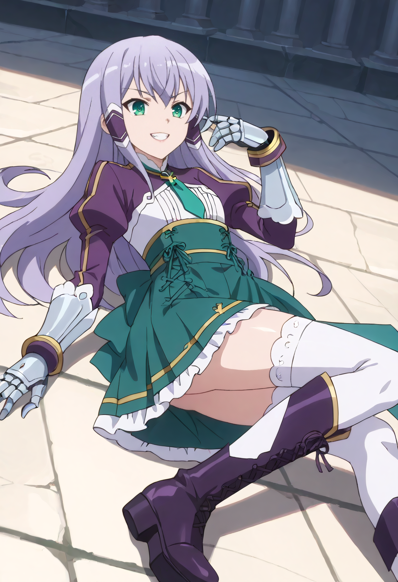 ElzeOutfit, 풍성한 소매, 넥타이, 긴 소매, 치마, 녹색 넥타이, 장갑, 줄리엣 소매, 녹색 치마, 흰색 장갑, 드레스, 히그스, 부츠, 프릴, 하이웨이스트 치마, 크롭 자켓, 자켓, 셔츠, 흰색 히그스,
