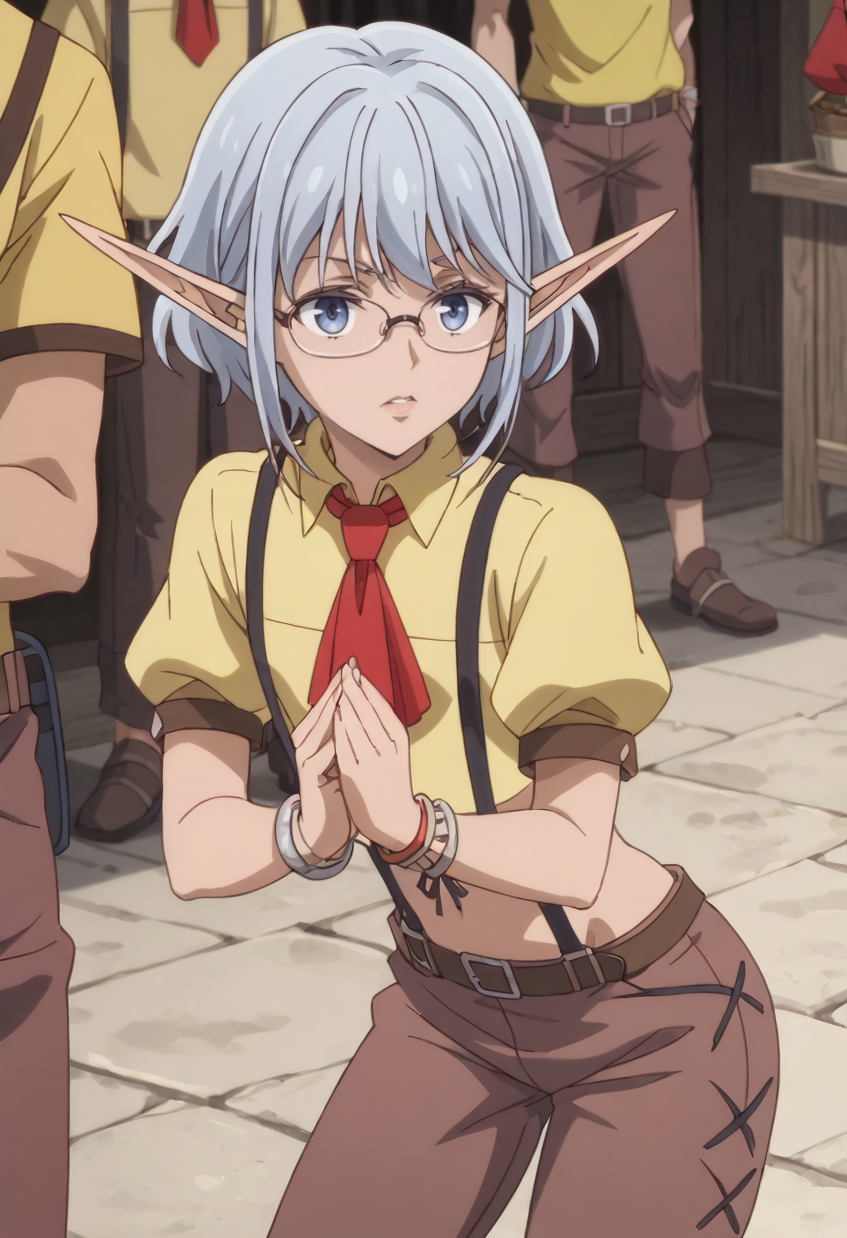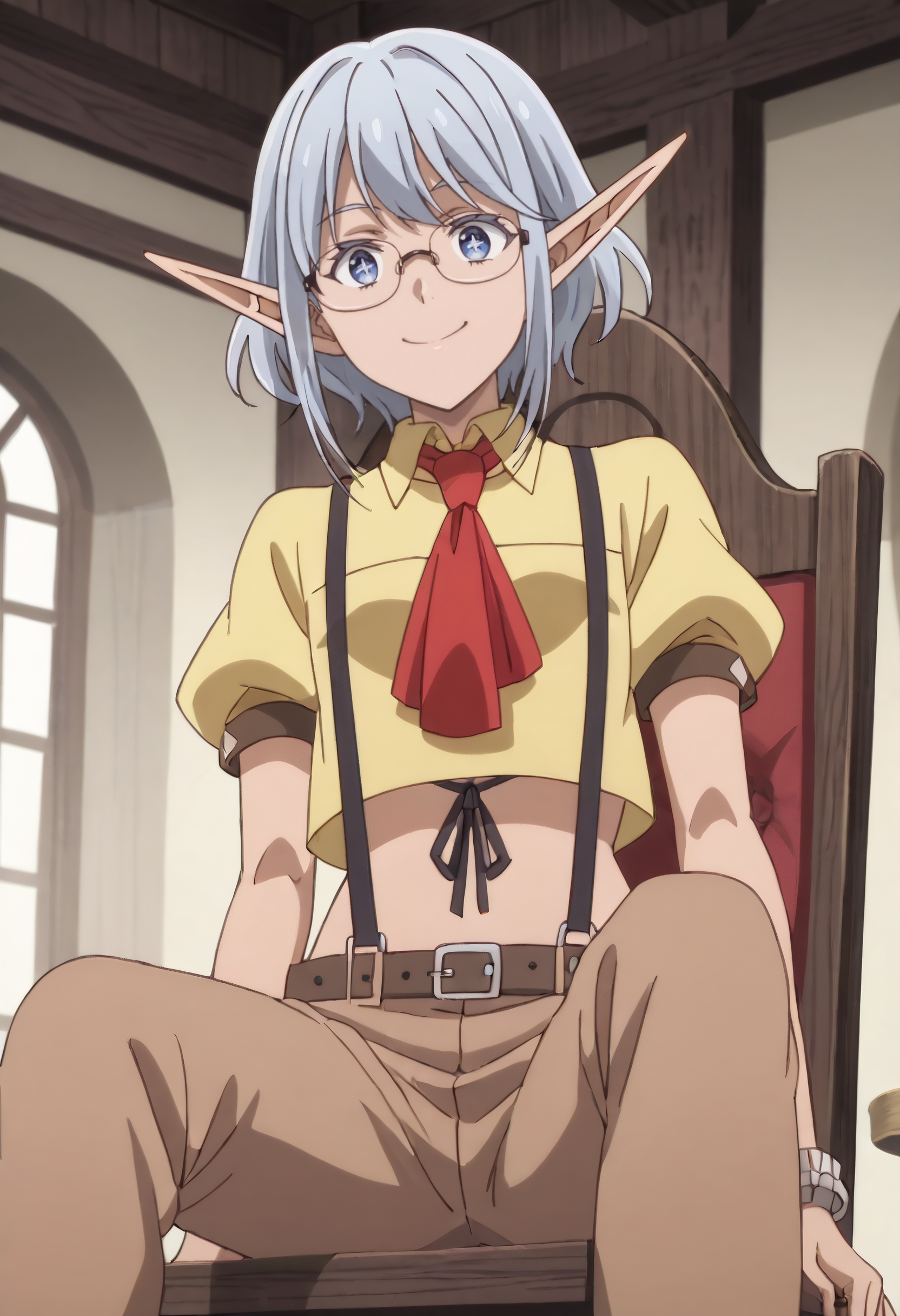 EmleOutfit、シャツ、サスペンダー、短い袖、ふくらはぎ袖、襟付きシャツ、お腹の部分、クロップドトップ、黄色のシャツ、ふくらはぎの短い袖、アスコット、ズボン、赤いネクタイ、ベルト、ネクタイ、ブレスレット、茶色のズボン、カーパー、靴、クロップドシャツ、