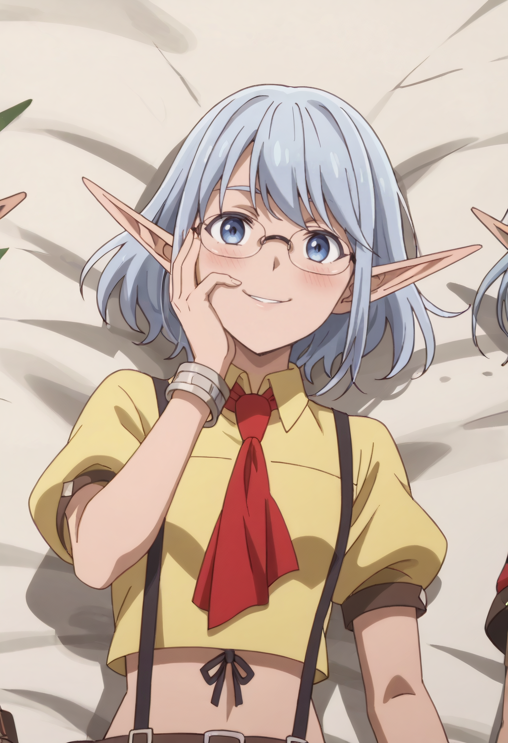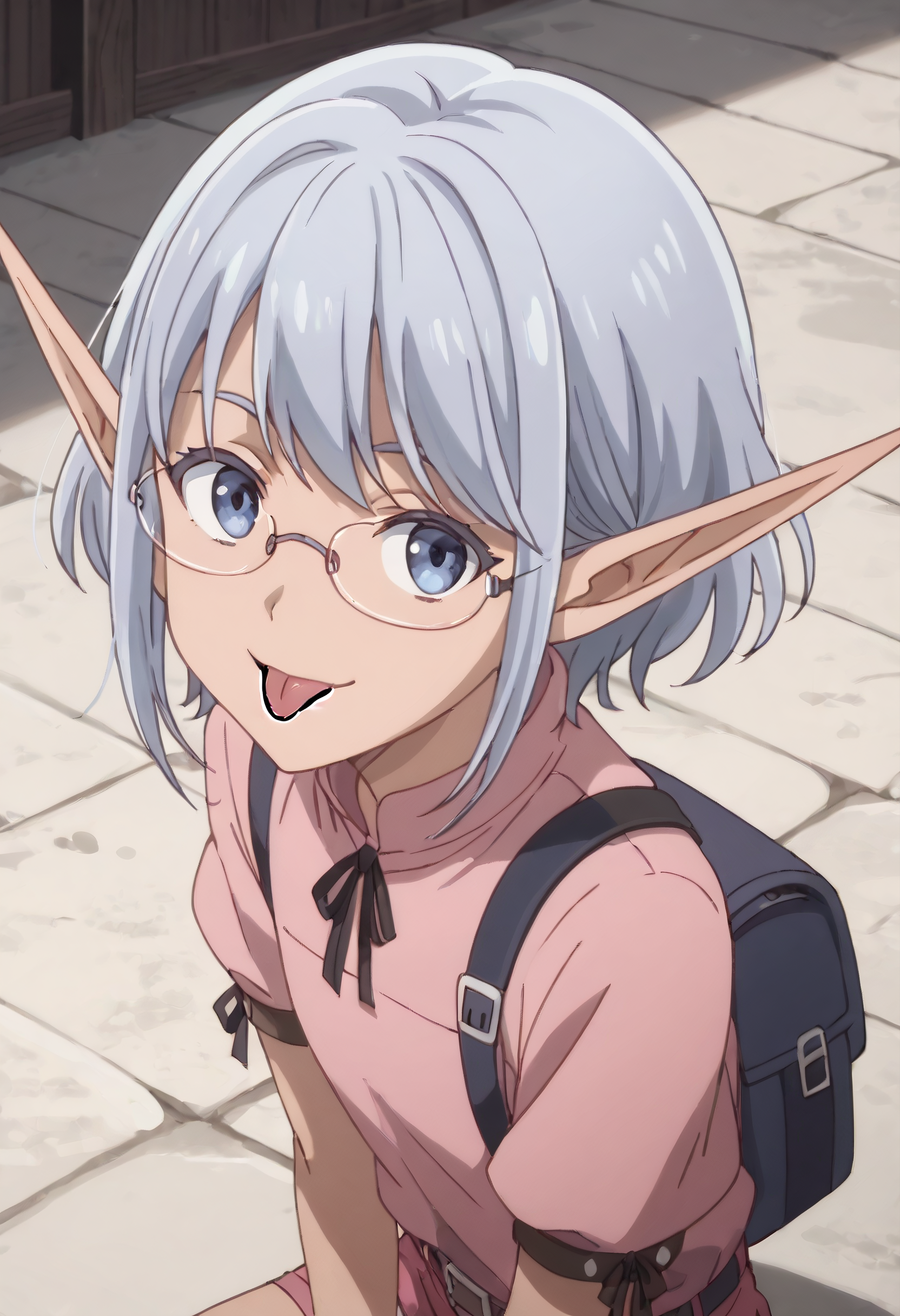 IMMEmle、とがった耳、短い髪、エルフ、青い髪、青い目、サイドロックス、長いとがった耳、ダークエルフ、眼鏡、フレームレス眼鏡、
