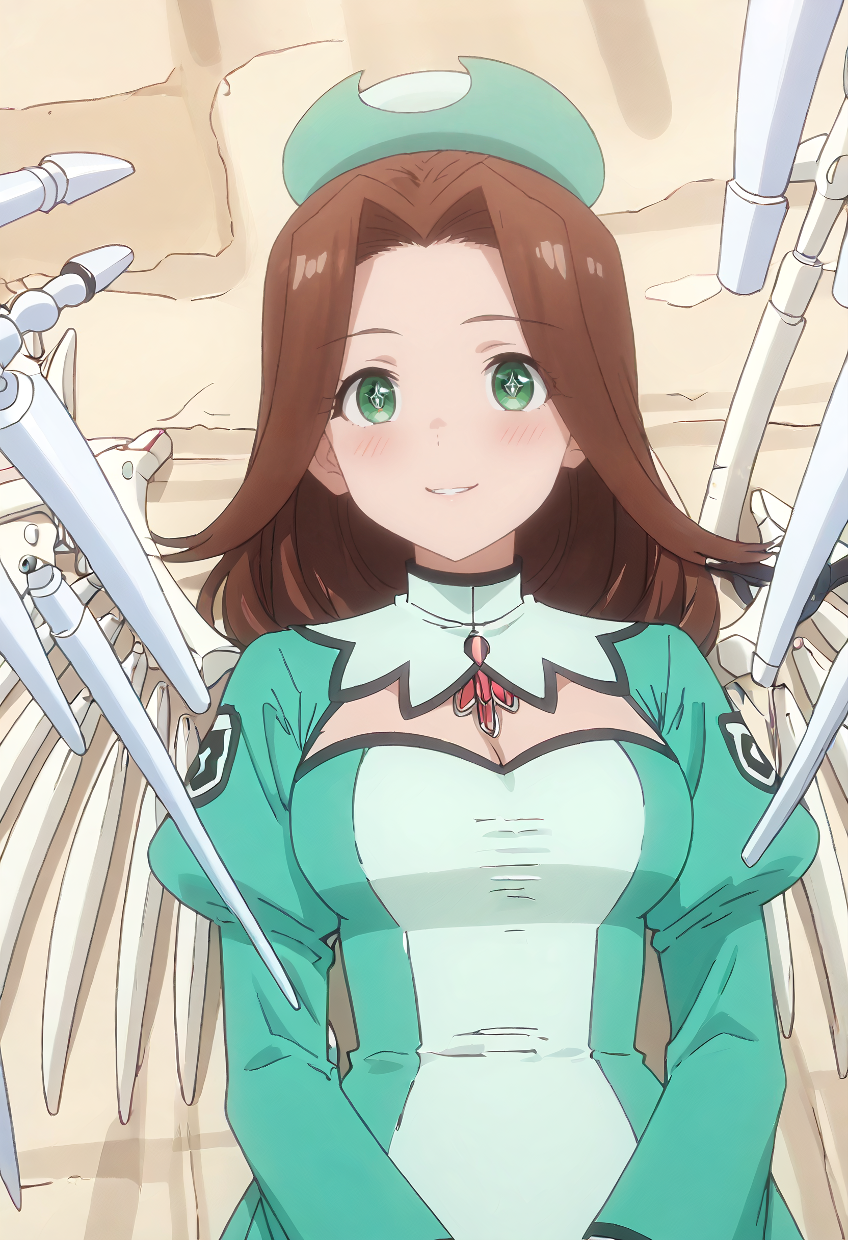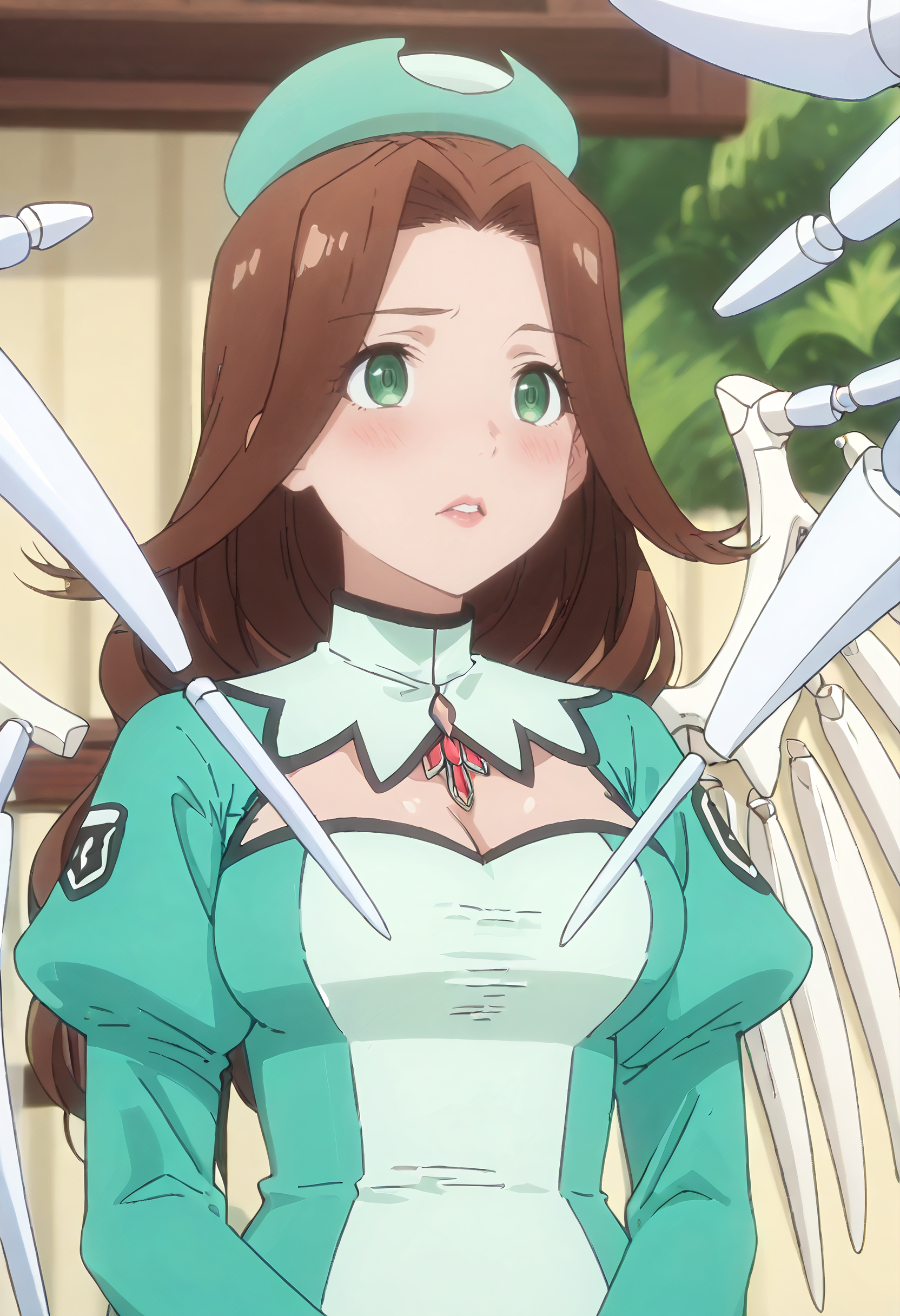 AngelOutfit, 날개, 모자, 녹색 모자, 가슴 부분 절개, 옷 절개, 베레모, 줄리엣 소매, 드레스, 긴 소매, 퍼프 소매, 녹색 드레스, 가슴, 녹색 머리장식, 기계식 날개, 한 쌍의 날개,