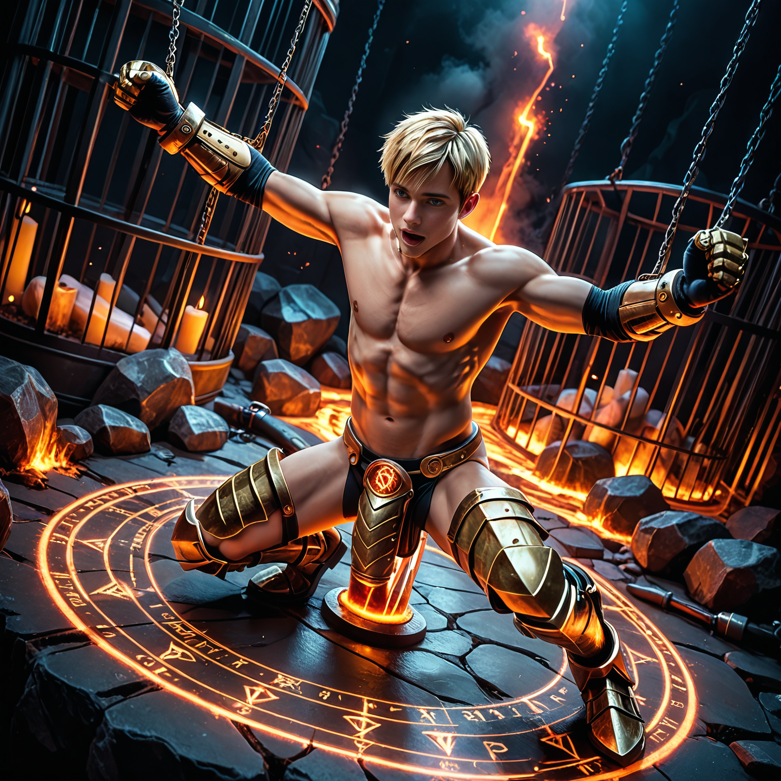 트리거 단어: "hell prison, chains, lava river, glowing magic circle, fire, demon, cage, binding runes, rune handcuff, rune shackle, molten rock"