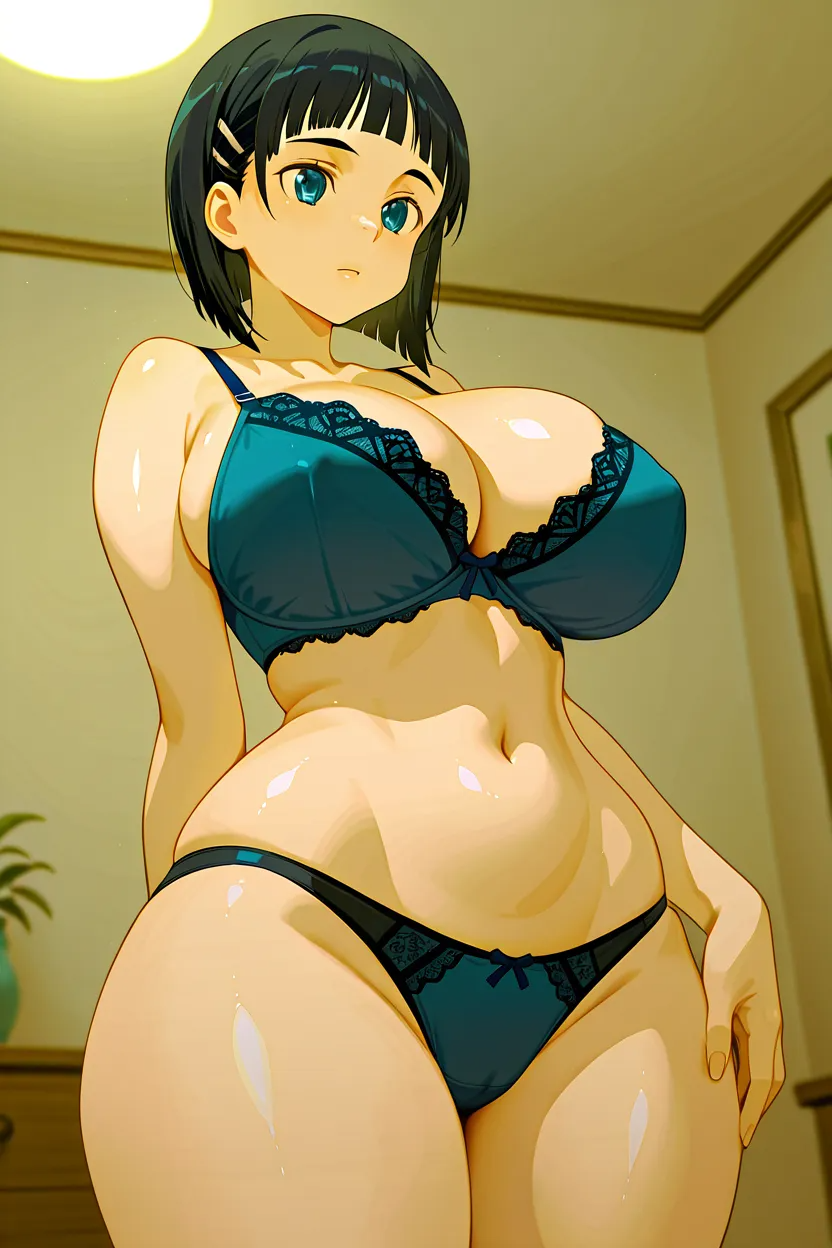1girl, Suguha Kirigaya (Sword Art Online), blue_eyes, black_hair, short_hair, lips, thick lips, glossy lips, massive_breasts, Sword Art Online_art_style, HD, hi-res, 4k, superb quality