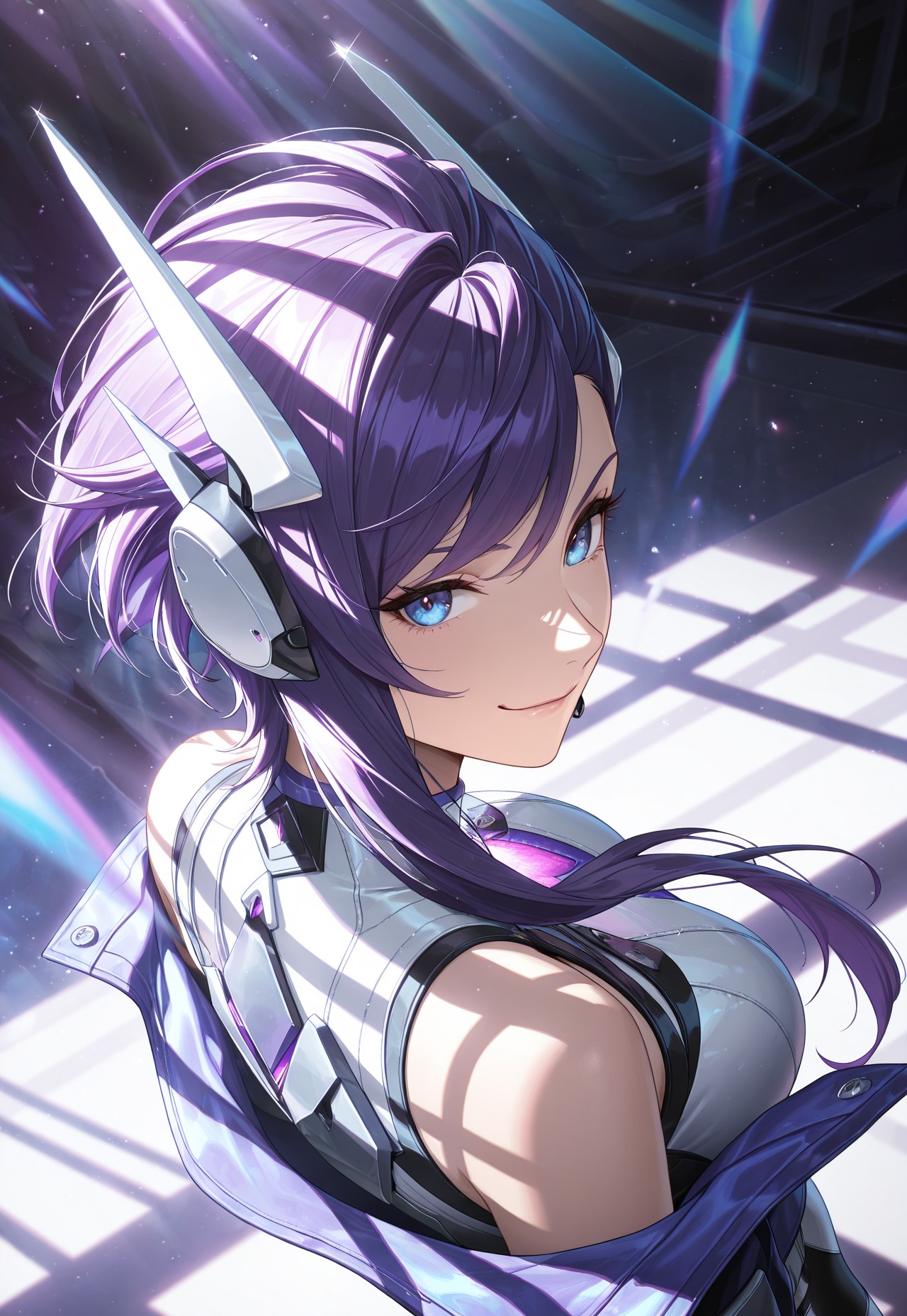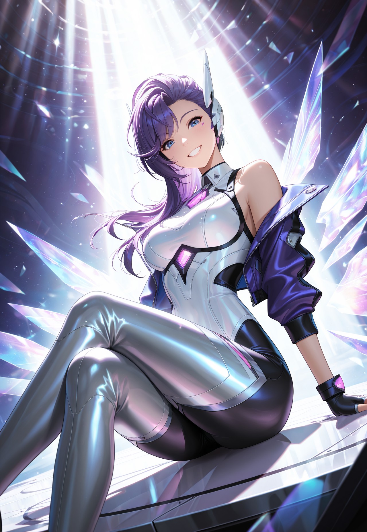 BDseraphine, purple hair, side swept bangs, asymmetrical hairstyle, blue eyes, protection earpiece, cropped jacket, bare shoulders, bodysuit, silver thighhighs, fingerless gloves,