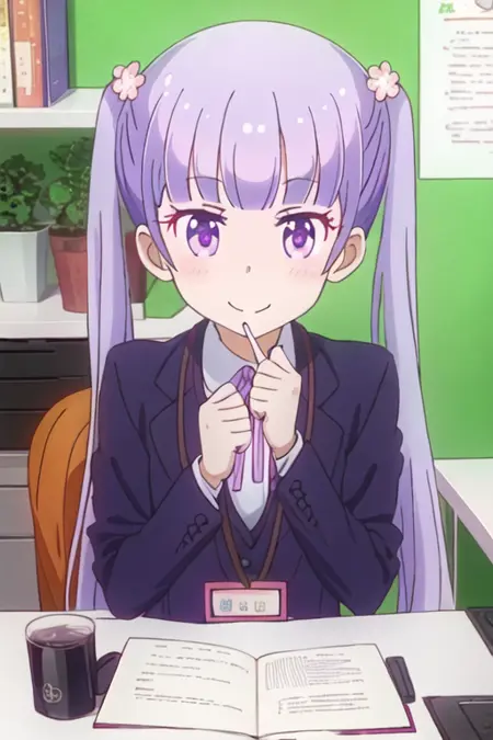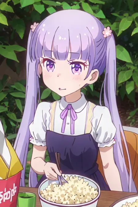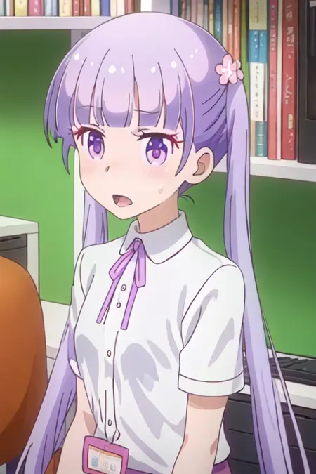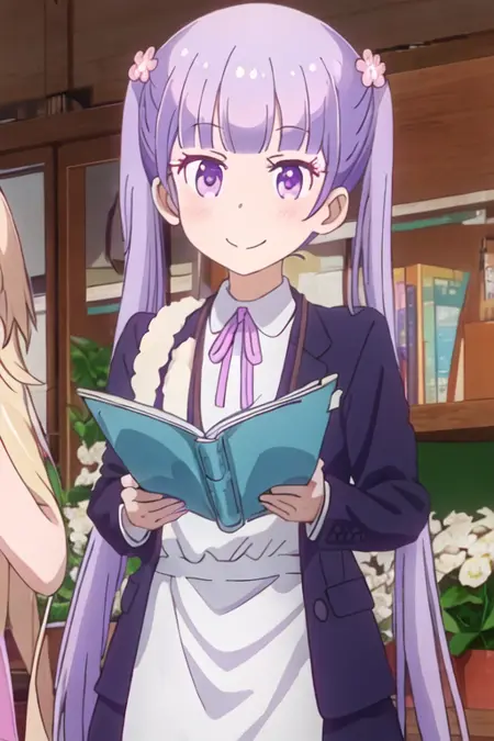 The trigger word is suzukaze_aoba_newgame, and the recommended tags are best quality, masterpiece, highres, solo, {suzukaze_aoba_newgame:1.15}, purple_hair, long_hair, twintails, purple_eyes, hair_ornament, flower, hair_flower, blush, ribbon, bangs, neck_ribbon.