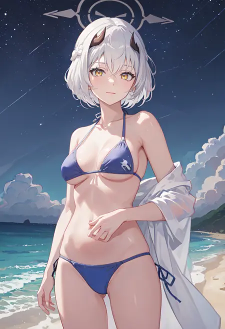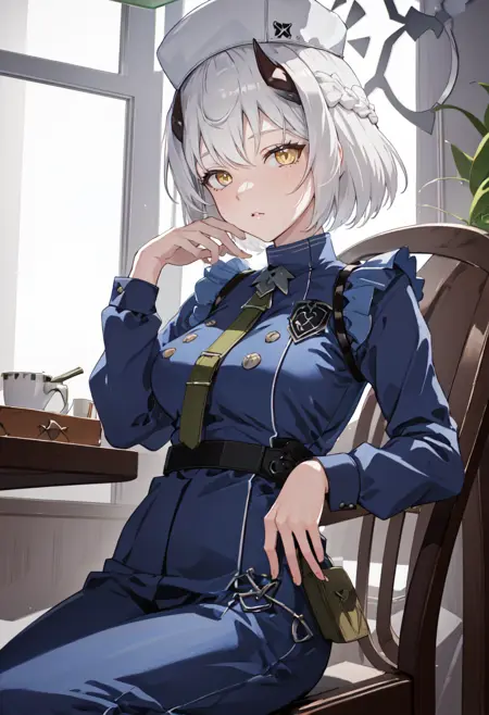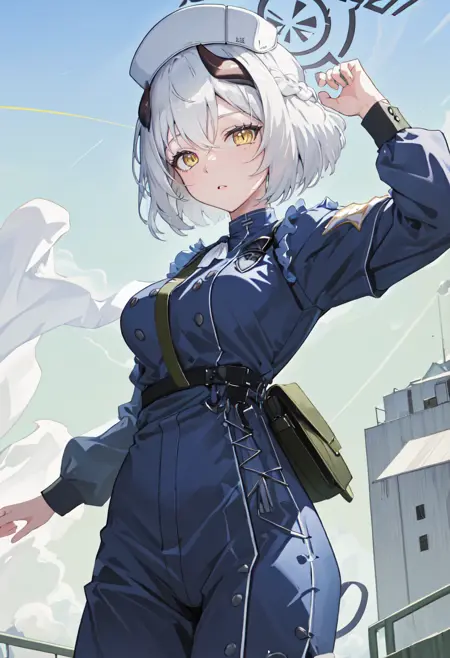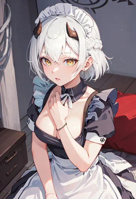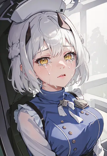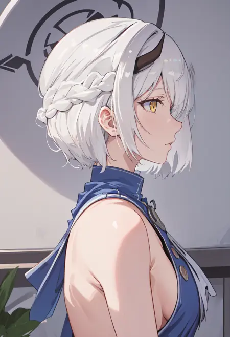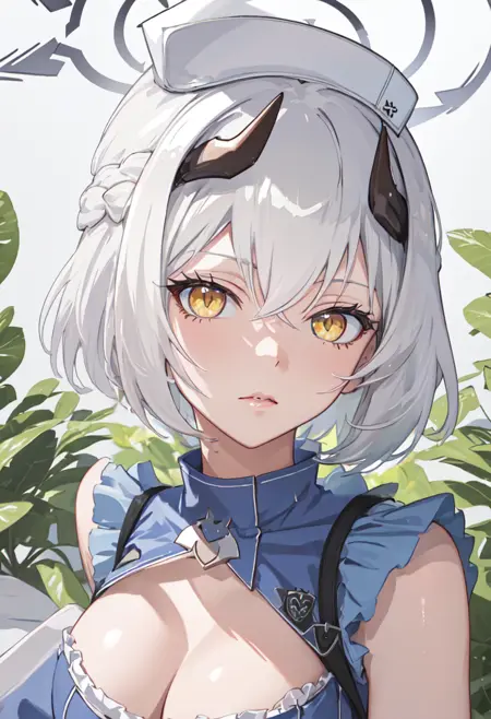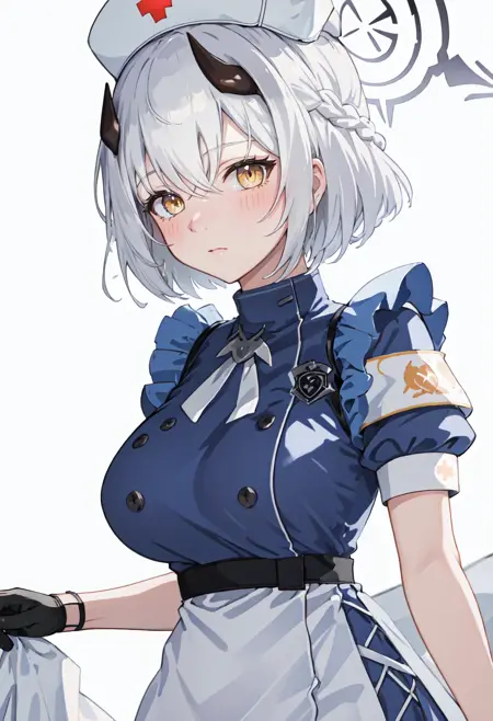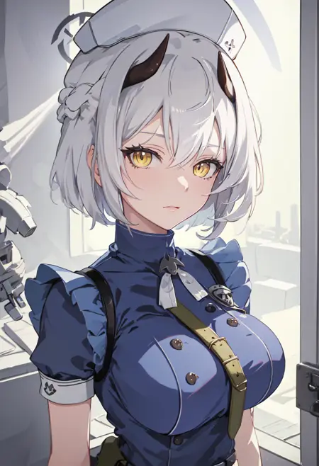 触发词为 sena_bluearchive,精简标签为 horns, short_hair, halo, yellow_eyes, braid, breasts, hat, white_hair, nurse_cap, large_breasts, black_horns, grey_hair。当某些特征(如发色)有时不够稳定时,您可以在提示词中加入这些标签。