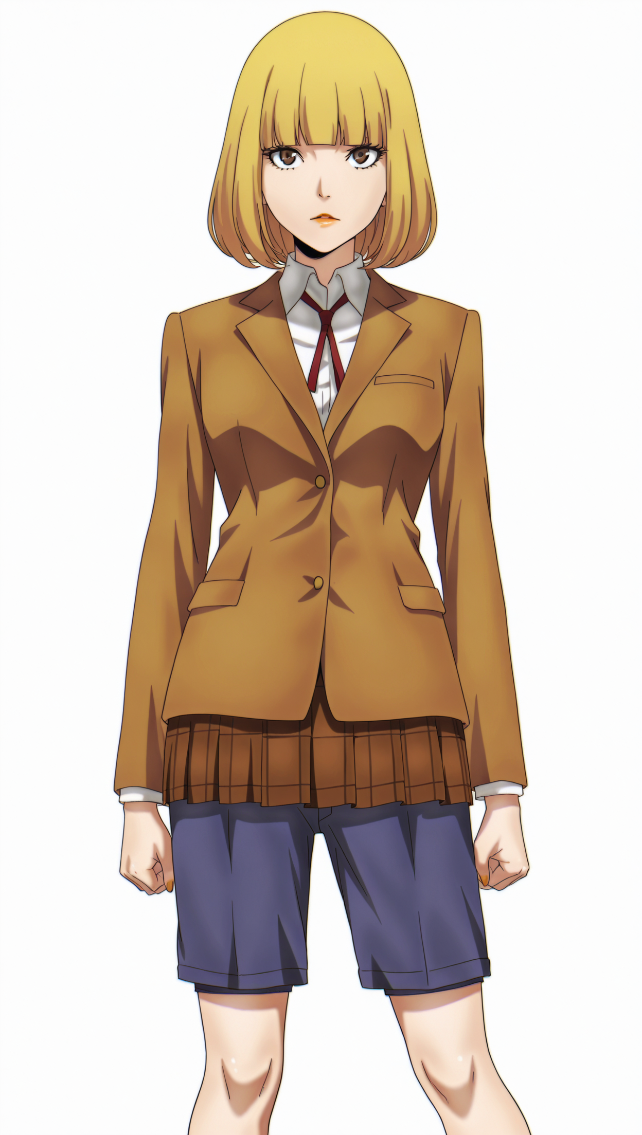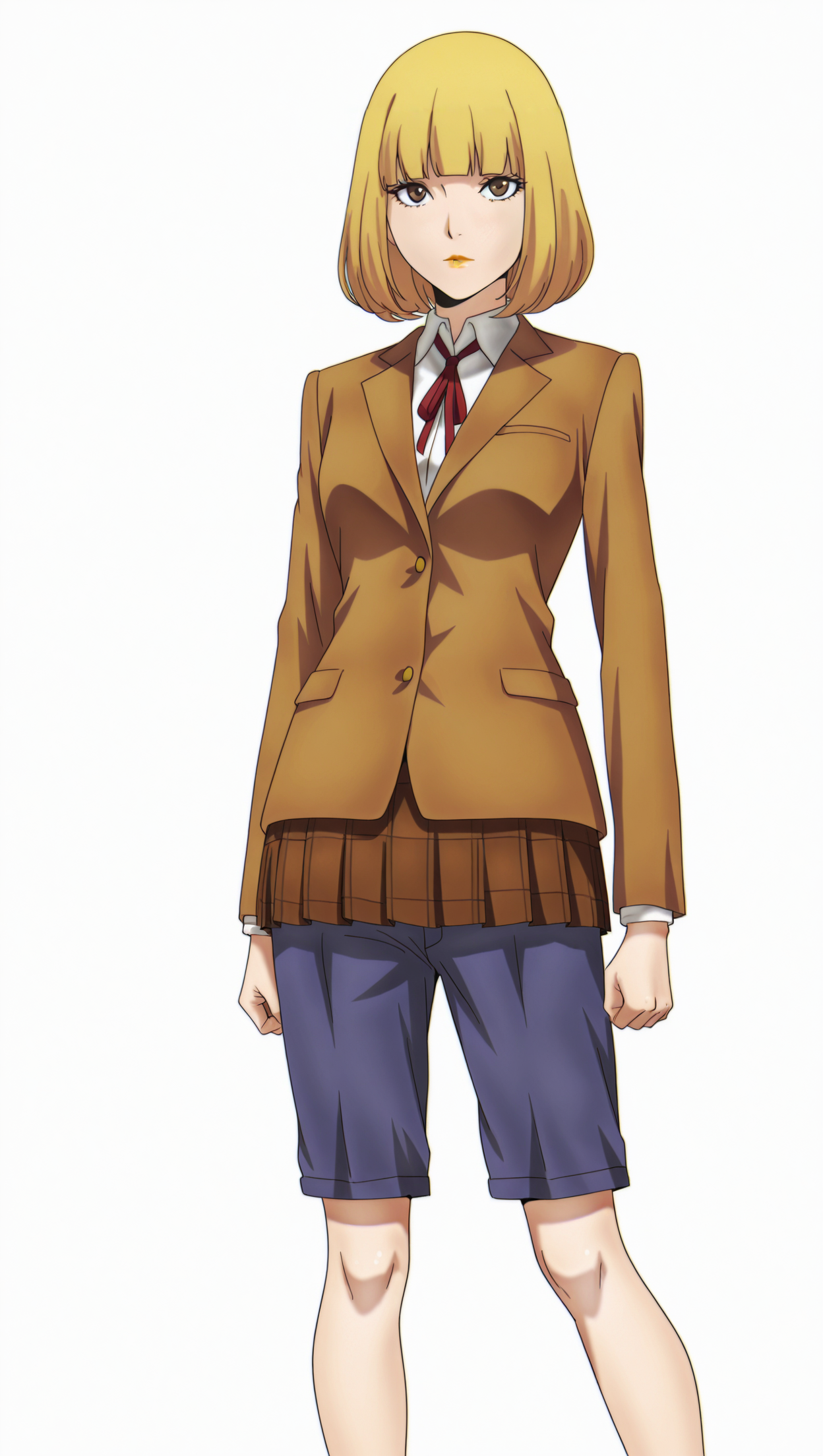 anime coloring, masterpiece, best quality, amazing quality, h4n4m1d0r1k4w4, 1girl, short hair, bob cut, blonde hair, brown eyes, medium breasts, orange lipstick, lipstick, school uniform, neck ribbon, shirt, white shirt, collared shirt, blazer, brown blazer, microskirt, brown skirt, plaid skirt, shorts under skirt, shorts, blue shorts, solo, pose, standing, looking at viewer, from front, ((((white background, simple background))))