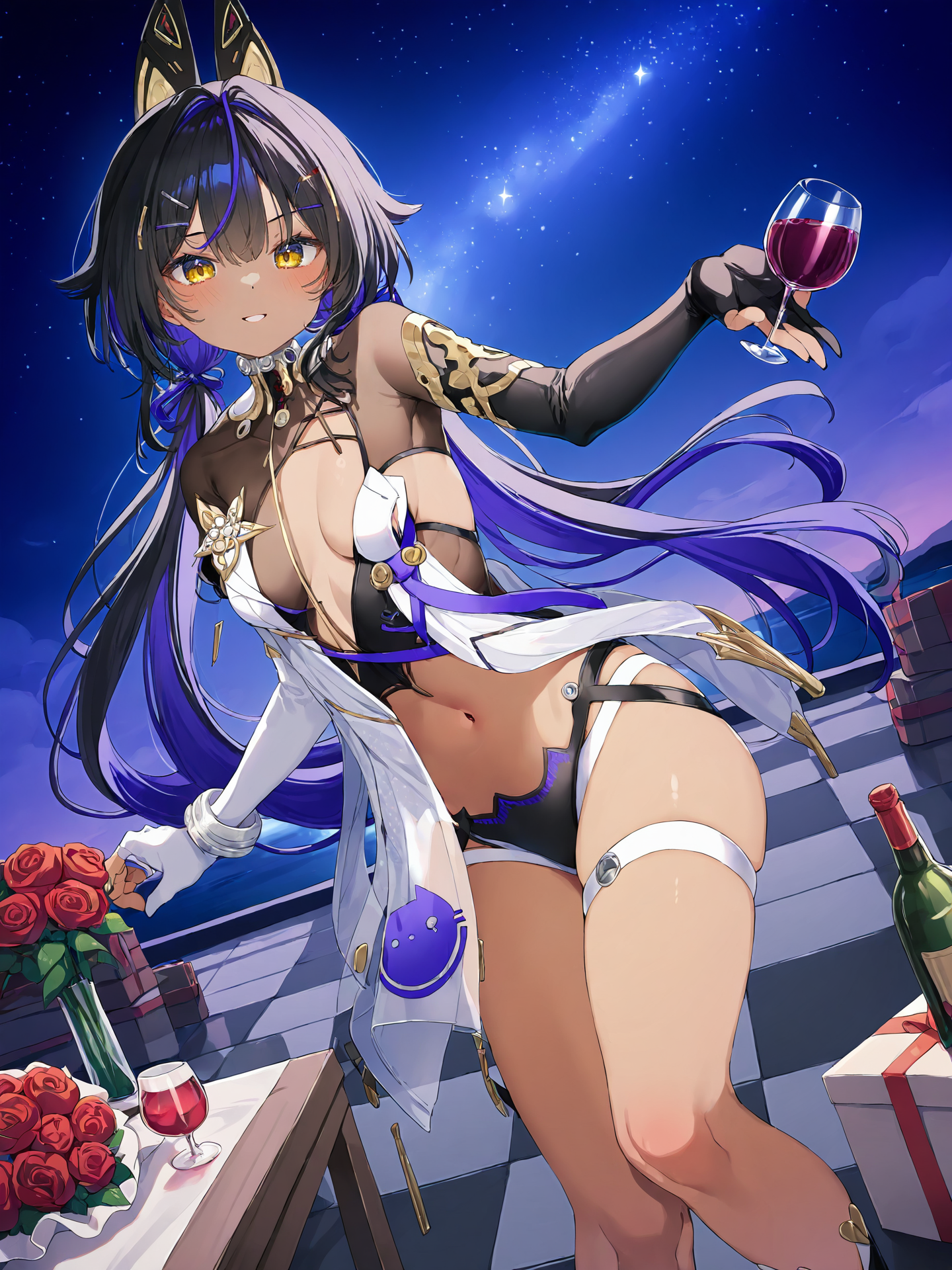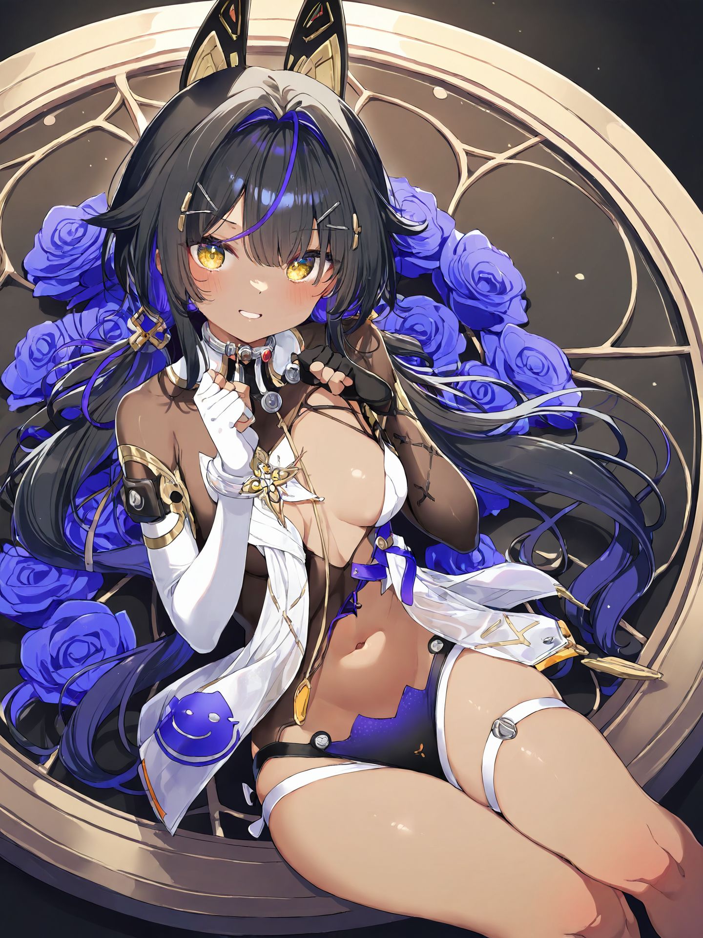 Prompt Words:Mauxir, Mauxir-Lotus, yellow eyes, black hair, purple hair, white hair, multicolored hair, hair ornament, mechanical cat ears, twintails, dark-skinned female