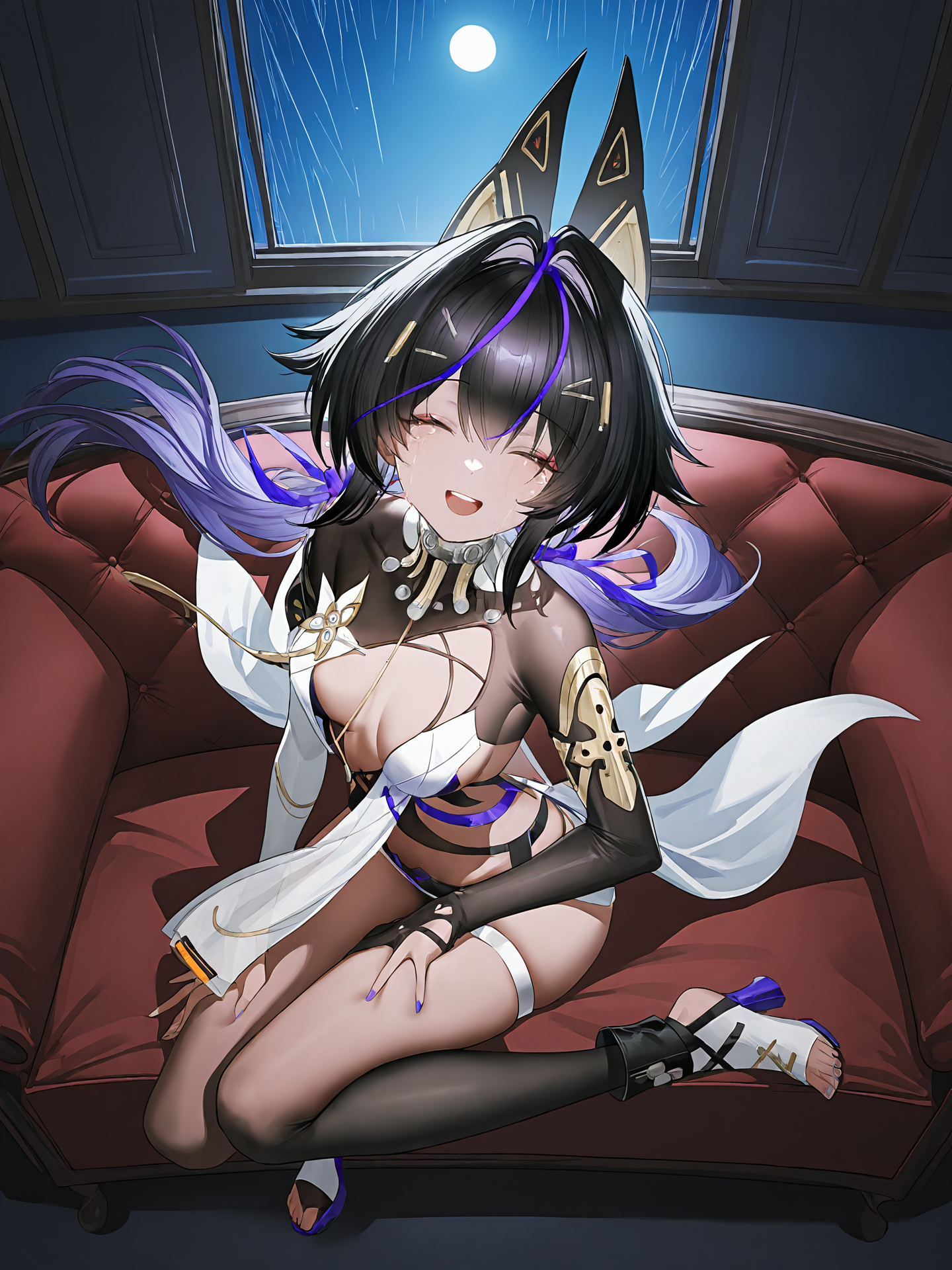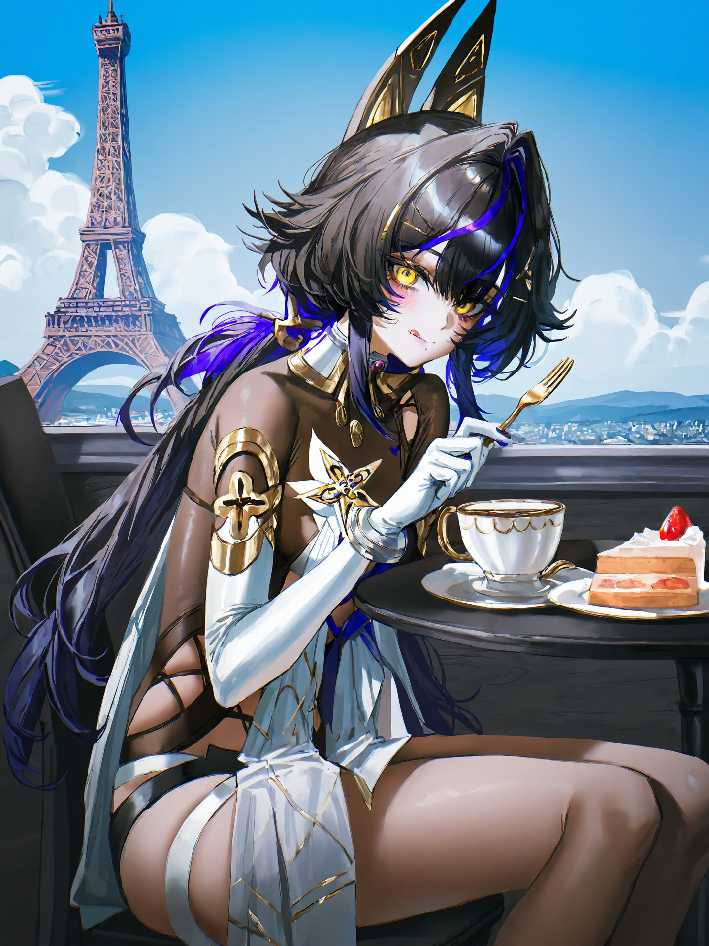 提示词:Mauxir, Mauxir-Lotus, yellow eyes, black hair, purple hair, white hair, multicolored hair, hair ornament, mechanical cat ears, twintails, dark-skinned female