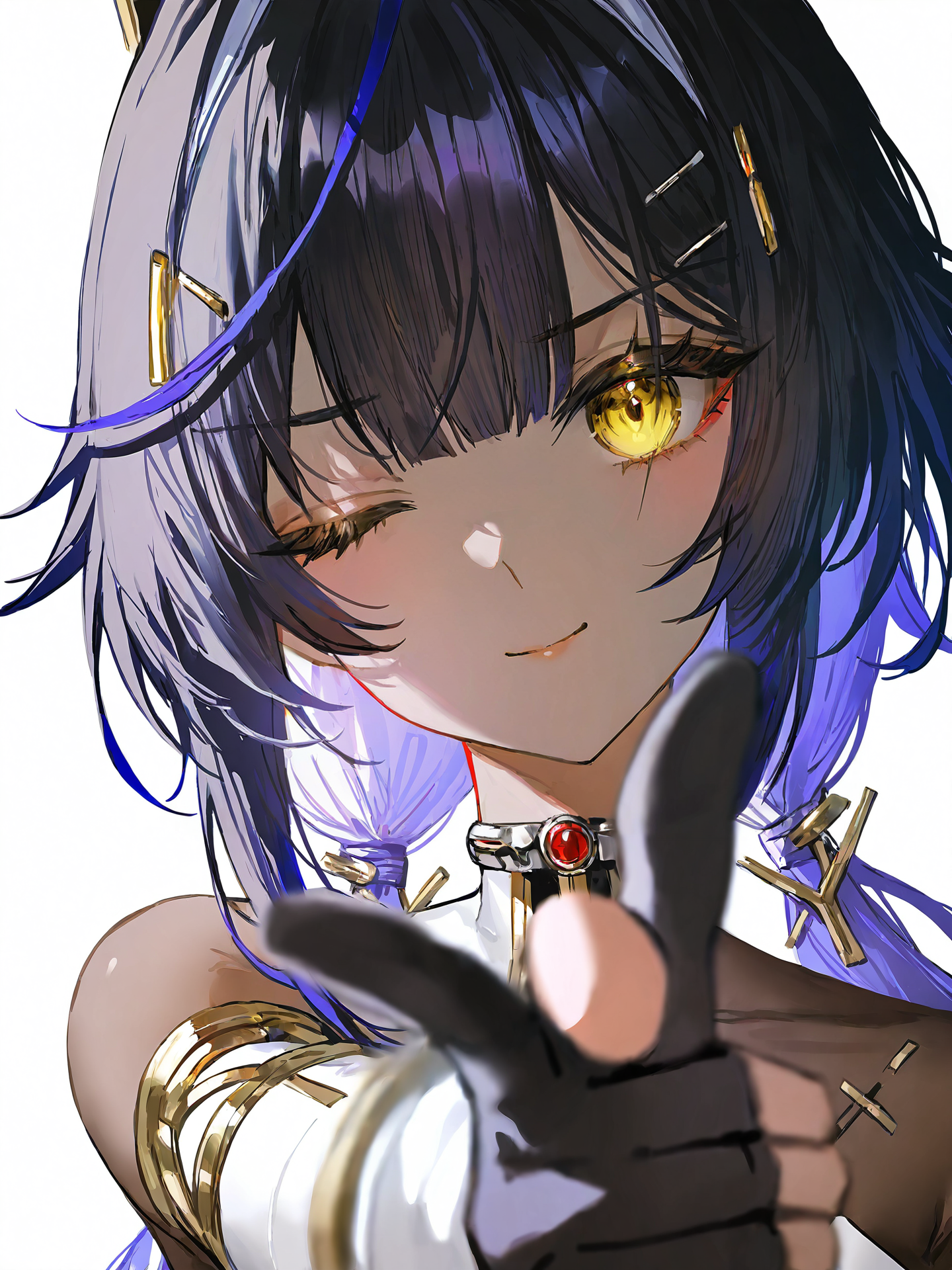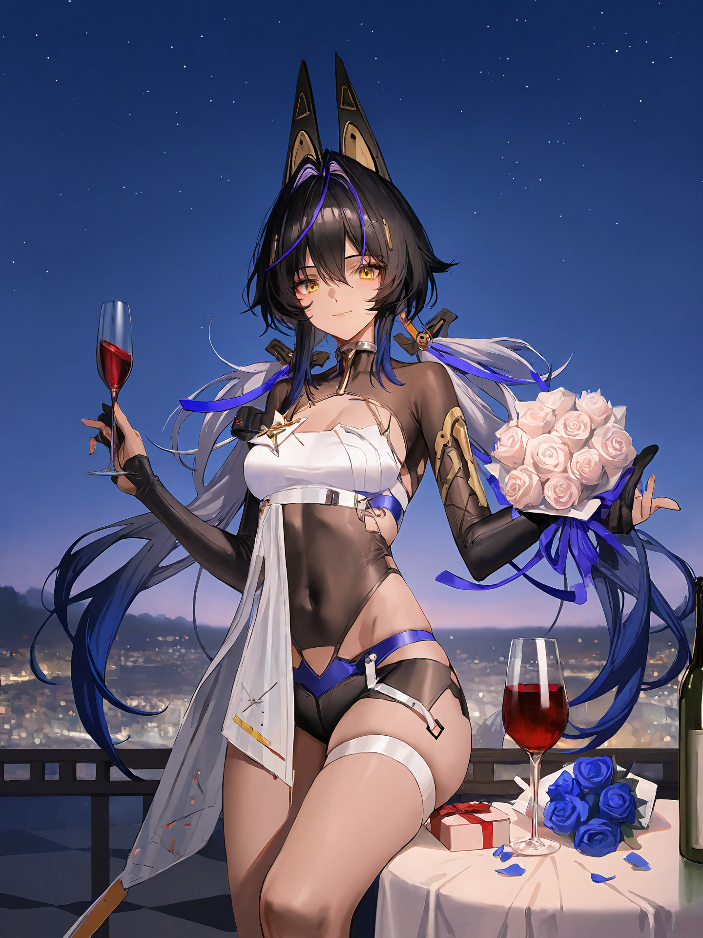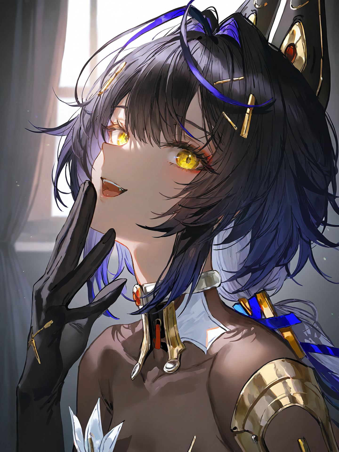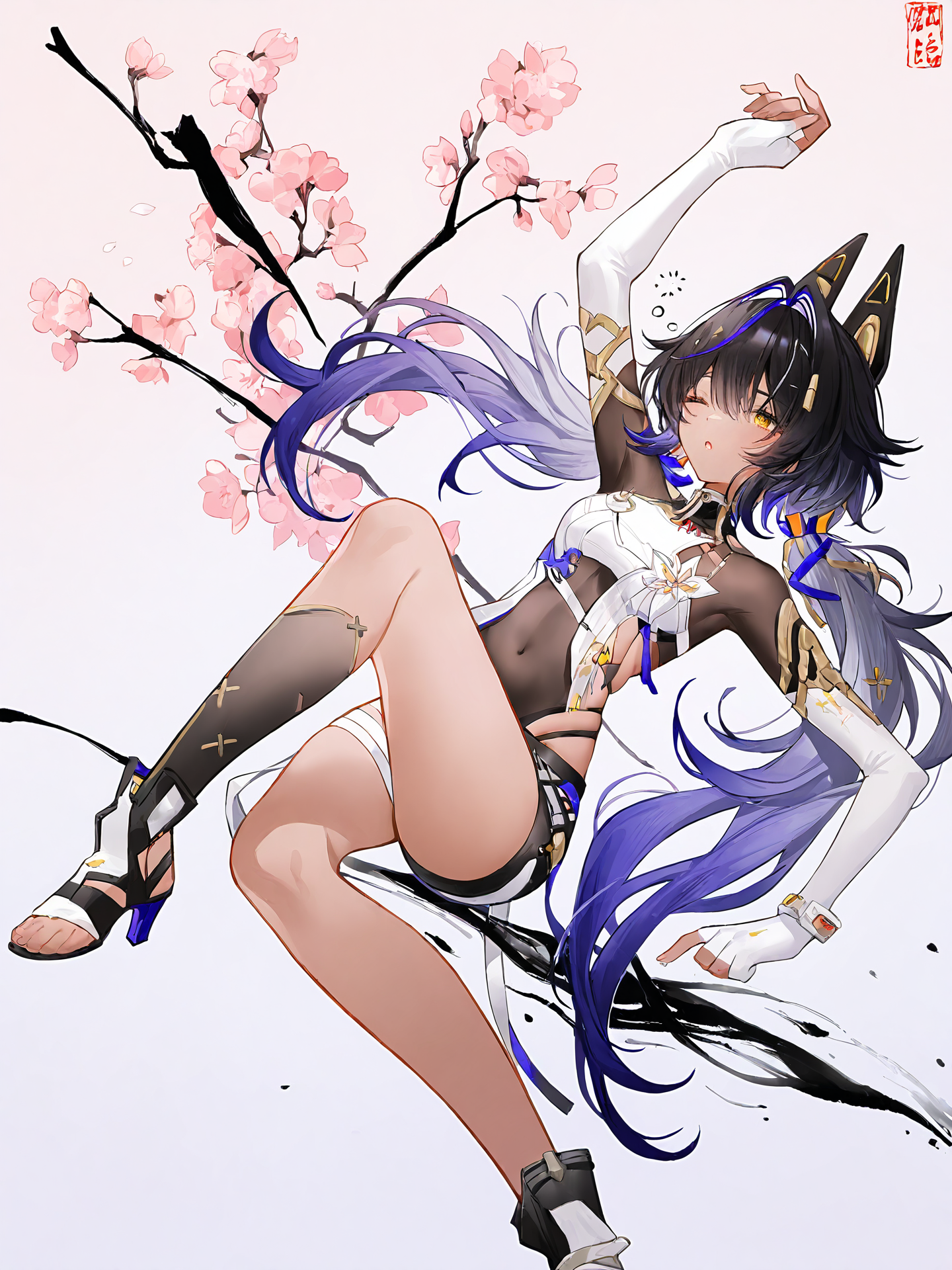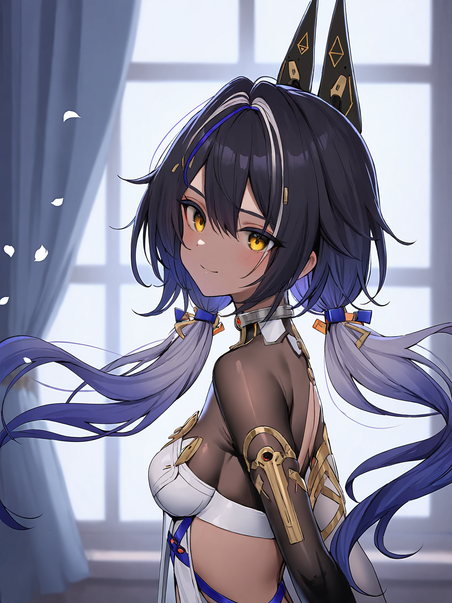 프롬프트: Mauxir, Mauxir-Lotus, 노란 눈, 검은 머리, 보라색 머리, 흰색 머리, 다색 머리, 머리 장식, 기계식 고양이 귀, 트윈테일, 검은 피부를 가진 여자