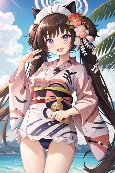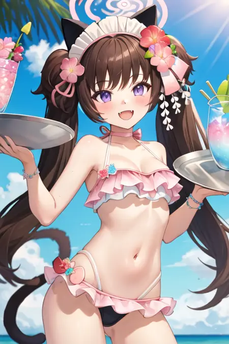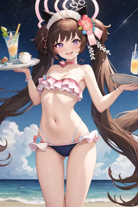 トリガーワードはshizuko_bluearchive、削除されたタグはhair_ornament, long_hair, maid_headdress, purple_eyes, brown_hair, halo, twintails, animal_ears, hair_flower, breasts, very_long_hair, small_breasts, fake_animal_earsです。ある時、特定の特徴(例:髪の色)が安定しない場合、これらをプロンプトに追加してください。