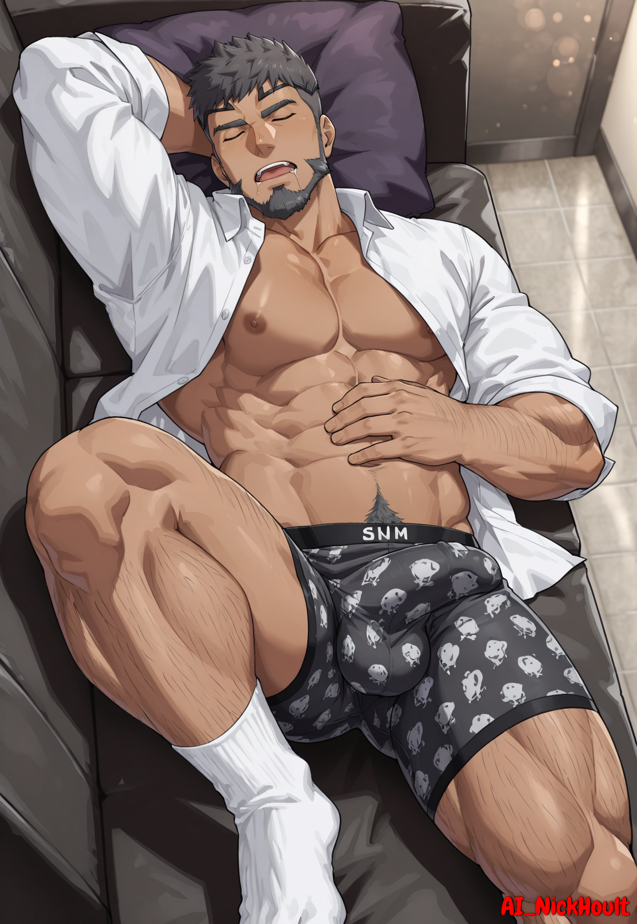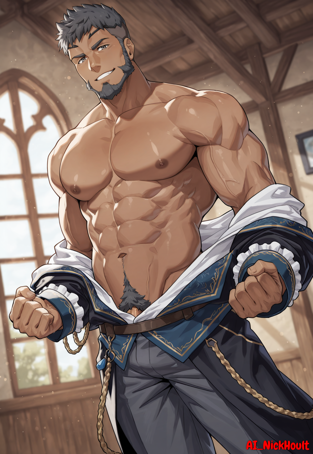 Mauvier, 성숙한 외모, 견고한 체격, 검은 회색 머리카락, 회색 눈, 단발, 언더컷, 수염, 태닝된 피부,