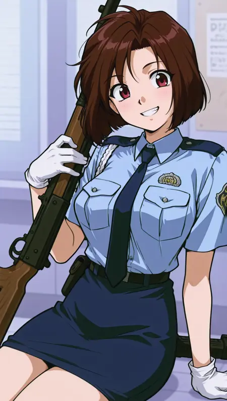 小早川美幸:手袋、リボン、ユニフォーム、銃、ピンクのリボン、ペンシルスカート、警察官制服、靴