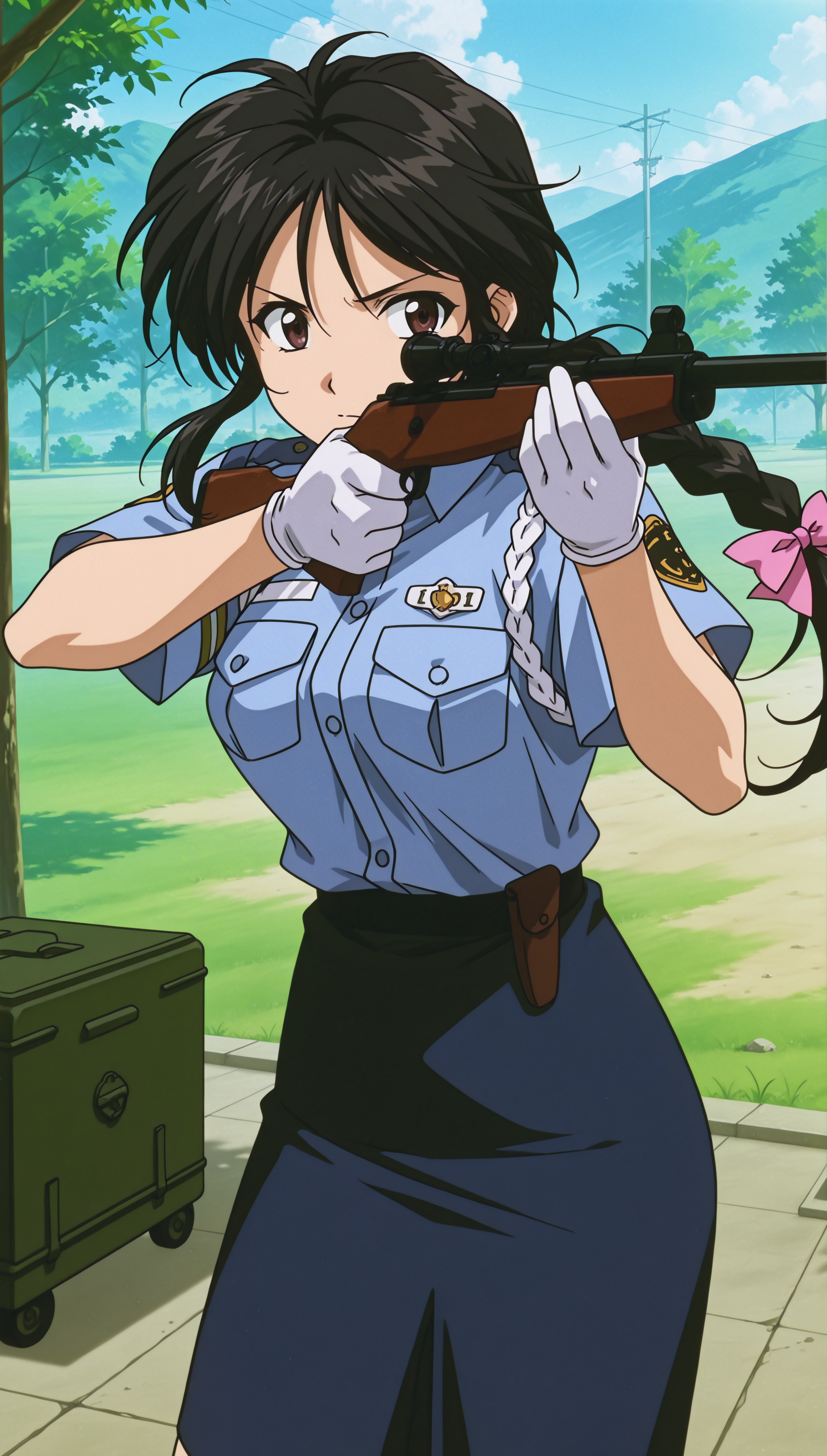 미유키 코바야카와: 장갑, 리본, 유니폼, 총, 분홍 리본, 연필 치마, 경찰 유니폼, 신발