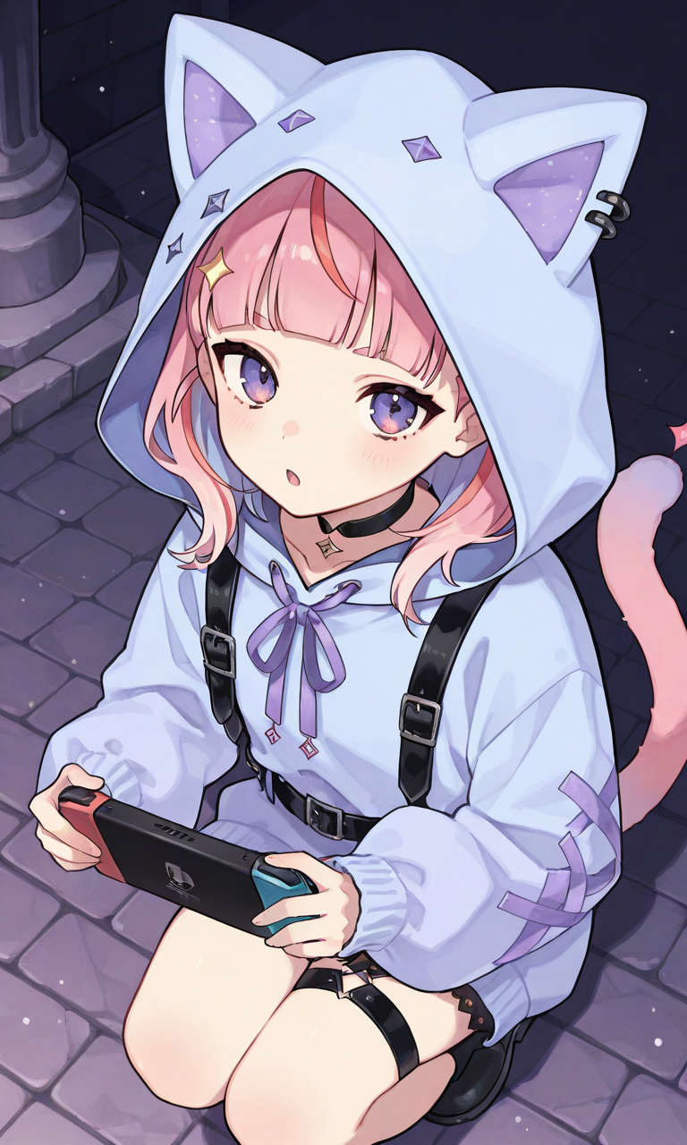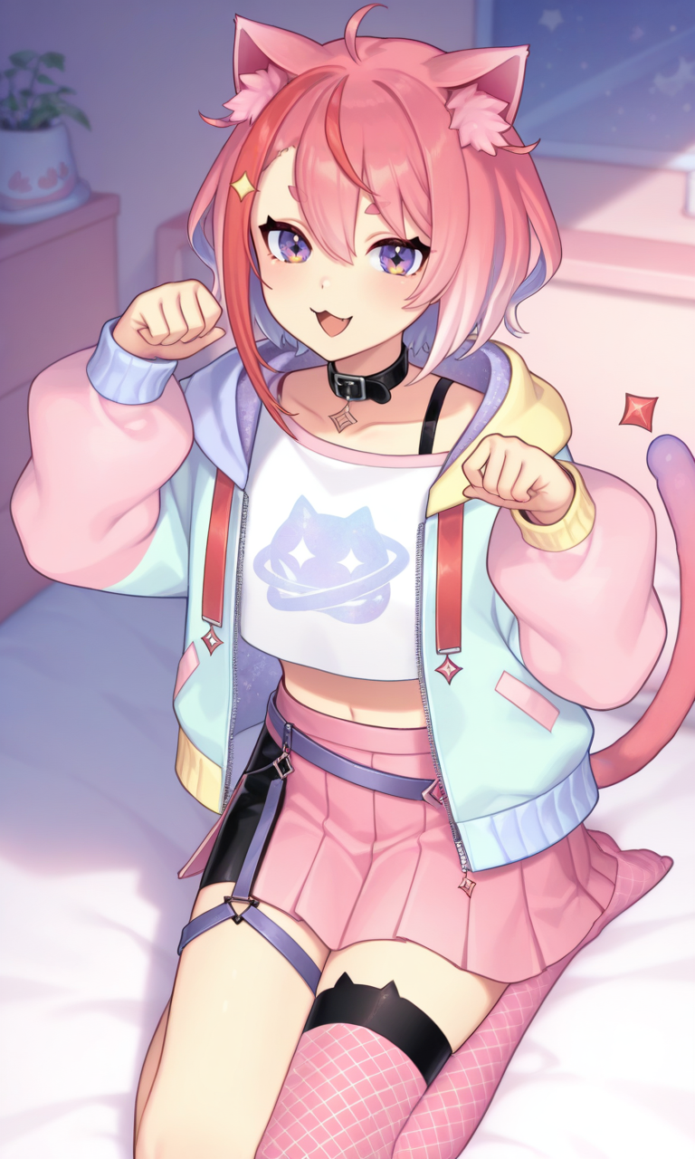 • 🍧デフォルト衣装:sorahoshi paru, paru default, cat ear, short hair, cat tail, black collar, multicolored jacket, hooded jacket, puffy long sleeves, white shirt, midriff, print shirt, pink skirt, pleated skirt, shorts under skirt, black shorts, single thighhigh, pink thighhigh, fishnet thighhigh
